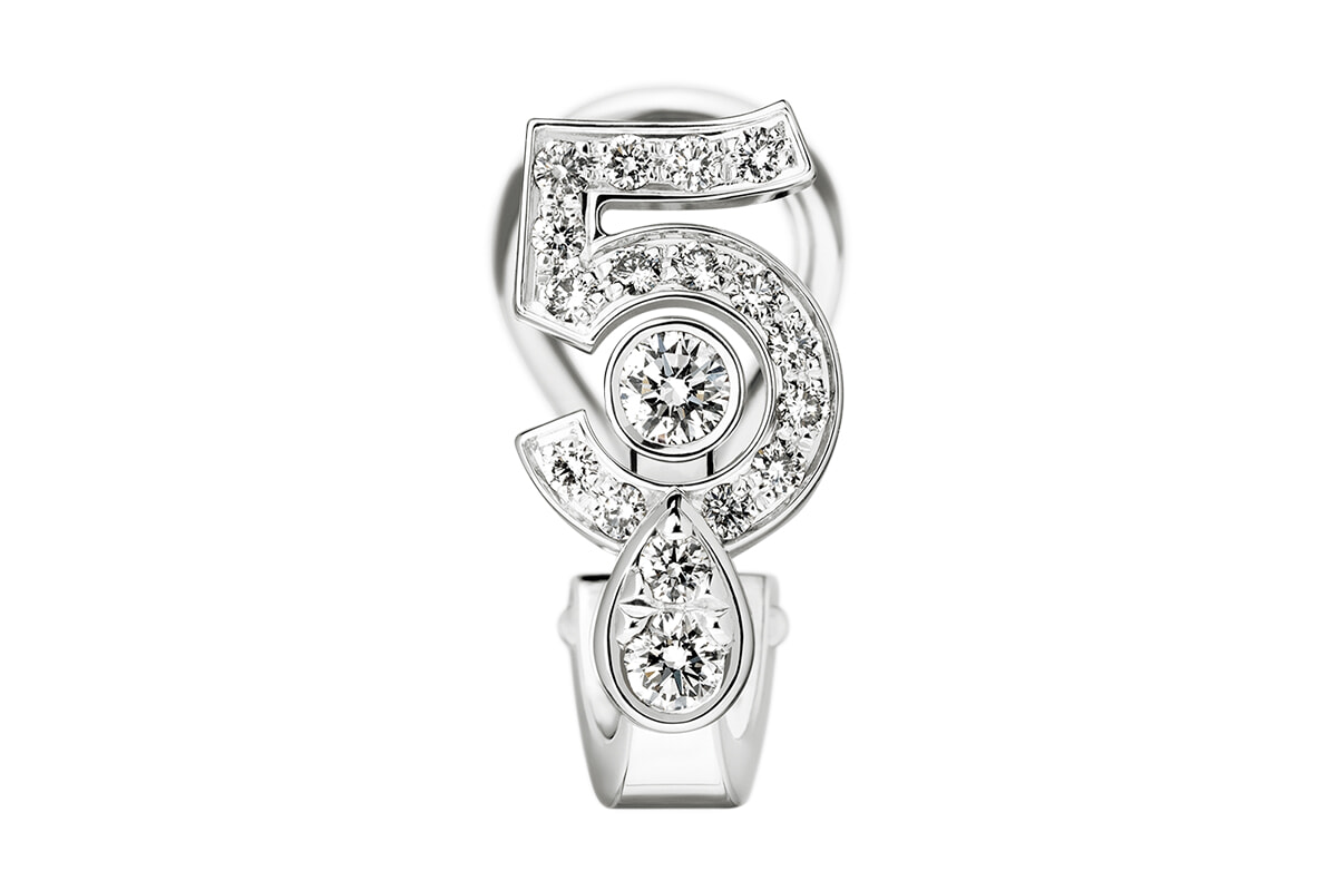 ブリリアントカットダイヤモンドが象るのは、ガブリエル・シャネルのラッキーナンバー5。グラフィカルにカーブしたデザインや、ドロップ形のモチーフに気品が宿る。「シャネル N°5」片耳用(WG×ダイヤモンド)¥643,500/シャネル(シャネル カスタマーケア)