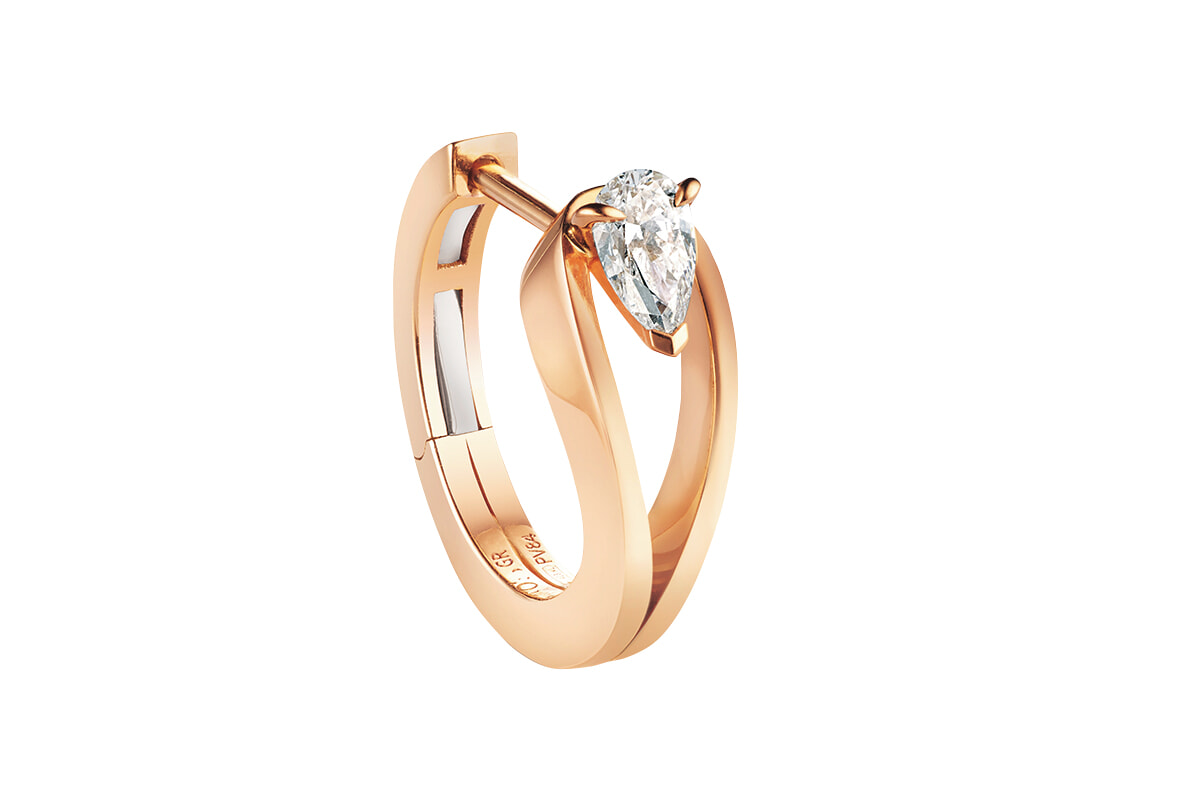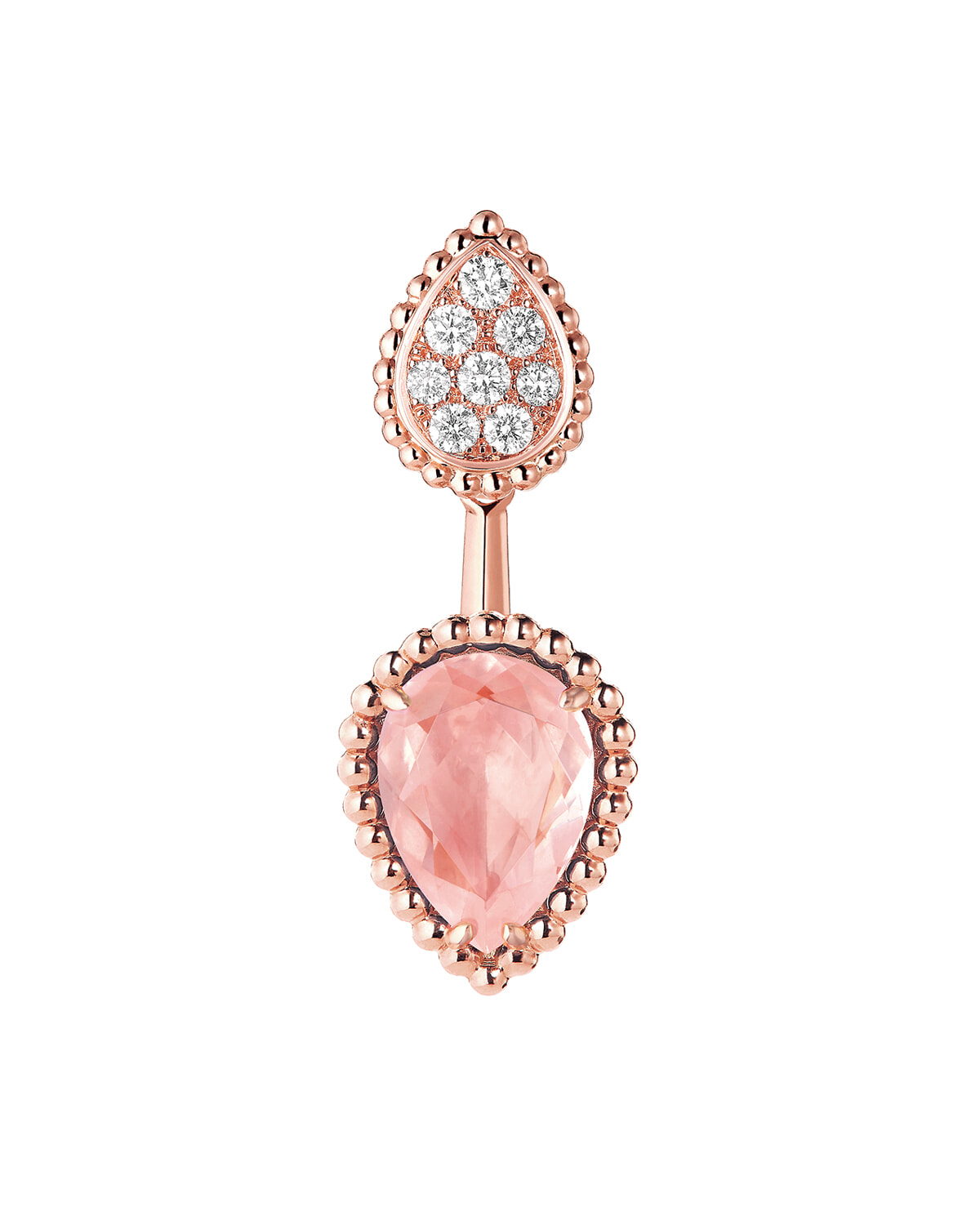 1968年のデビュー以来人気のドロップ形のシングルイヤリング。雫が滴るように瑞々しいクオーツが魅力的。「セルパンボエム 2モチーフ シングルスタッズ イヤリング」(PG×ピンククオーツ×ダイヤモンド)¥495,000/ブシュロン(ブシュロン クライアントサービス)
