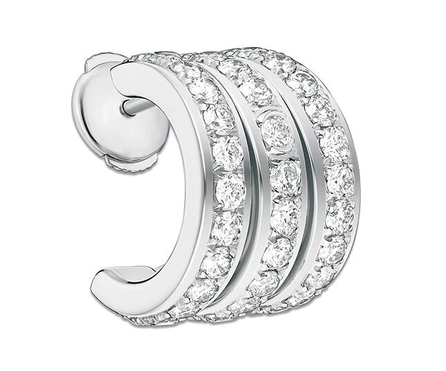 ブリリアントカットダイヤモンドを並べ、リュクスな三重奏で魅了するイヤリング。メゾンならではのダイヤモンドセッティングと技巧を駆使したデザインで有機的なカーブを描く。「ポセション」(WG×ダイヤモンド)¥770,000/ピアジェ(ピアジェ コンタクトセンター)