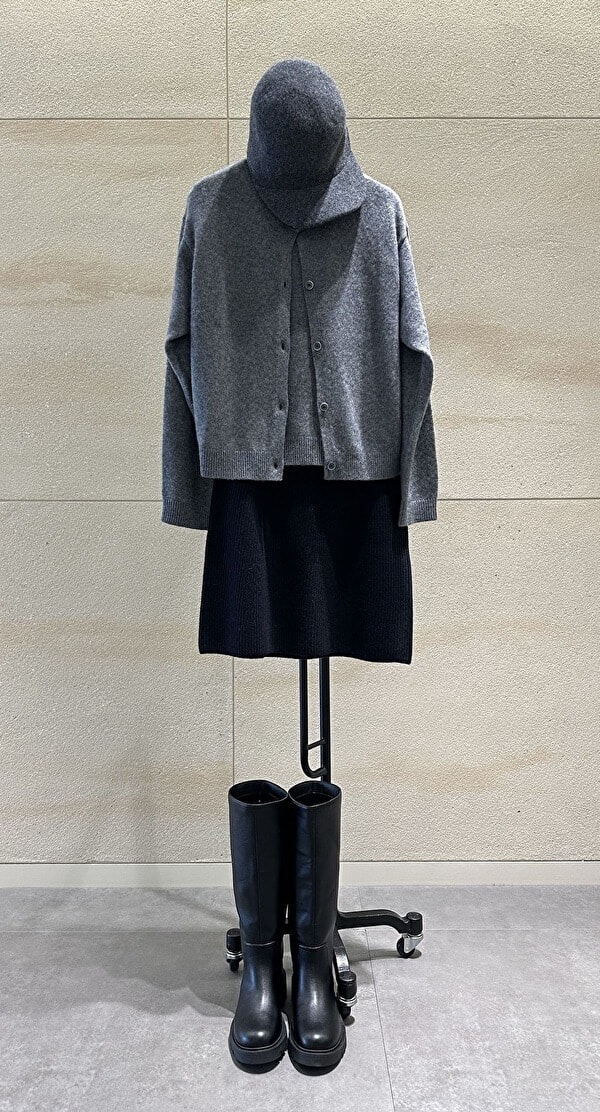 「カシミヤのなめらかな触り心地に、素肌に着ても心地良さそう!とアンサンブルをチョイス。普段ならここにパンツを合わせるところですが、今日は思い切ってトレンドのミニスカートとロングブーツでこなれた秋のスタイルにしてみました。肌見せしていますが、全身落ち着いたワントーンでまとめているので、若くなりすぎずきっと大人でもトライしやすいはず。最後に、同系色のウールキャップでさりげないアクセントを加えて、完成です!」(編集AT)
