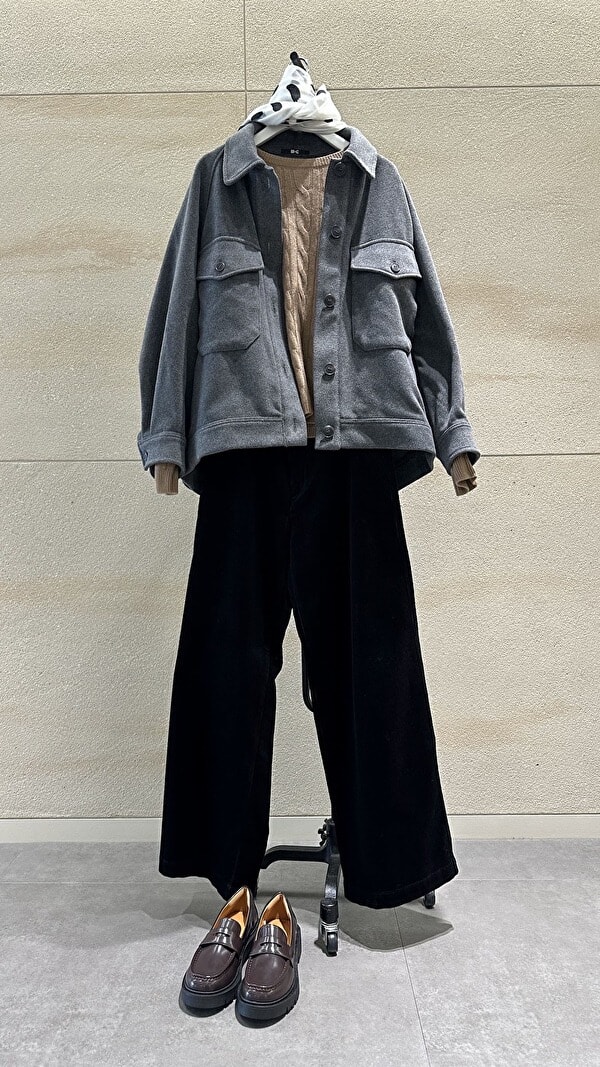 オーバーサイズジャケット¥7,990、カシミヤケーブルクルーネックショートセーター¥10,900、コーデュロイワイドパンツ¥4,990、大判コットンシルクスカーフ¥1,990、コンフィールタッチローファー¥4,990/以上ユニクロ:シー(ユニクロ)