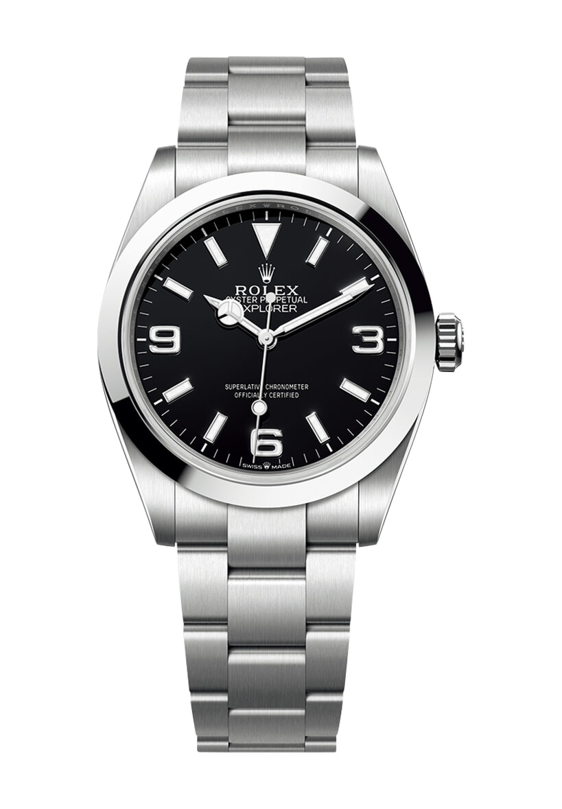 名品ウォッチに新しく40mmサイズが仲間入り。1930年代に開発された3列リンクのブレスレットは、堅牢さと洗練さを兼ね備え、現代にエターナルな魅力を放つ。「エクスプローラー 40」(SS、φ40mm、自動巻き)¥909,700/ロレックス(日本ロレックス)