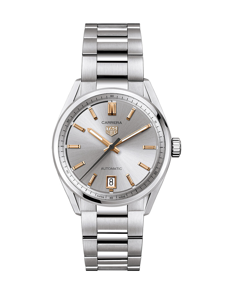 ラグスポウォッチの名作「カレラ」の誕生60周年を記念し、初代と同じケース径が登場。当時よりも華奢なブレスレットが腕元を彩る。「タグ・ホイヤー カレラデイト」(SS×RG、φ36mm、自動巻き)¥396,000/タグ・ホイヤー(LVMHウォッチ・ジュエリー ジャパン タグ・ホイヤー)