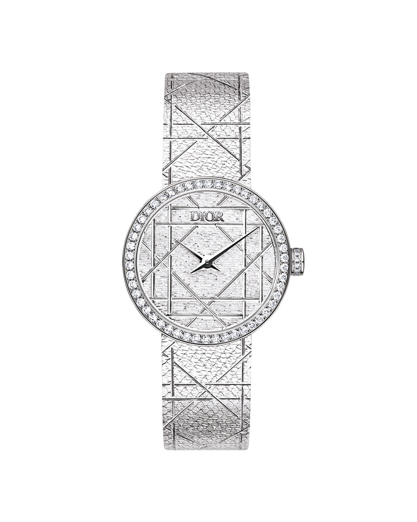 「時を告げるリボン」をコンセプトにデザイン。文字盤まで続くレリーフ技法で、メゾンのシンボル、カナージュを繊細に描いた。「ラ デ マイ ディオール」(SS×ダイヤモンド、φ25mm、クオーツ)¥1,350,000/ディオール タイムピーシズ(クリスチャン ディオール)