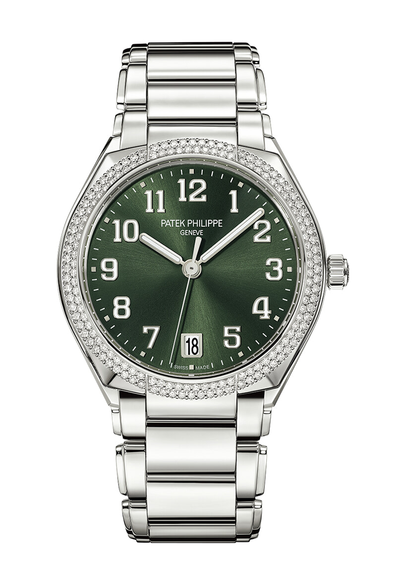 鮮やかなフェイスを裏返せば、精密で美しい自動巻きムーブメントを鑑賞できる。「トゥエンティ~4 オートマチック7300/1200A」(SS×ダイヤモンド、φ36mm、自動巻き)¥3,949,000/パテック フィリップ(パテック フィリップジャパン・インフォメーションセンター)