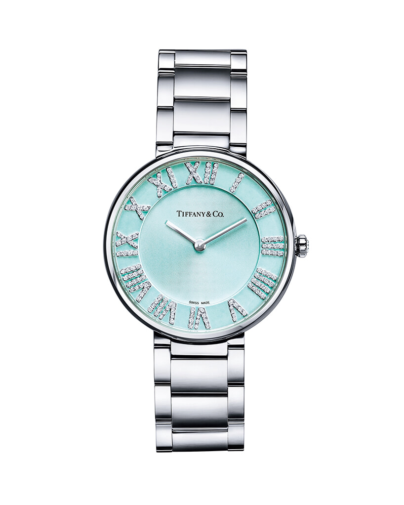 ティファニーブルーのフェイスに、リュクスなダイヤモンドのローマ数字のインデックスをあしらって。本店のアトラス クロックより着想。「ティファニー アトラス」(SS×ダイヤモンド、φ34mm、クオーツ)¥968,000/ティファニー(ティファニー・アンド・カンパニー・ジャパン・インク)