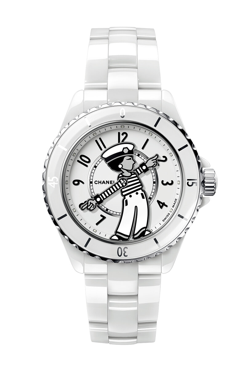 ダイアルにはボーダーTを着て、水兵帽を被ったマリンスタイルのマドモアゼル。両腕を伸ばし、時を知らせる。「マドモアゼル J12 ラ パウザ」(高耐性ホワイトセラミック×SS、φ38mm、自動巻き、数量限定)¥1,452,000/シャネル(シャネルカスタマーケア)
