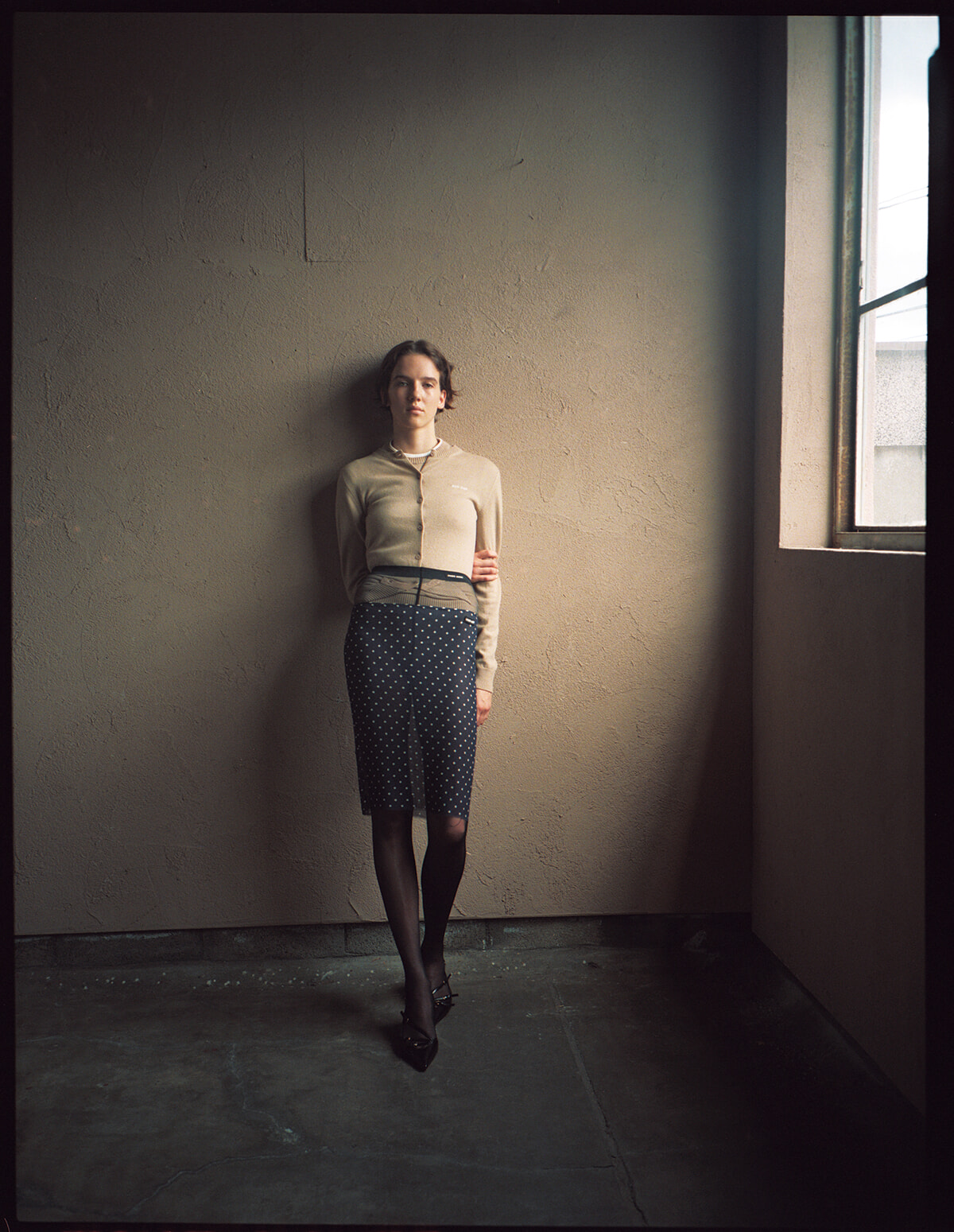 カーディガン¥209,000、中に着たトップ¥181,500、中に着たTシャツ¥80,300、スカート¥163,900、ストッキング¥39,930、パンプス¥165,000(すべて予定価格)/以上ミュウミュウ(ミュウミュウ クライアントサービス)