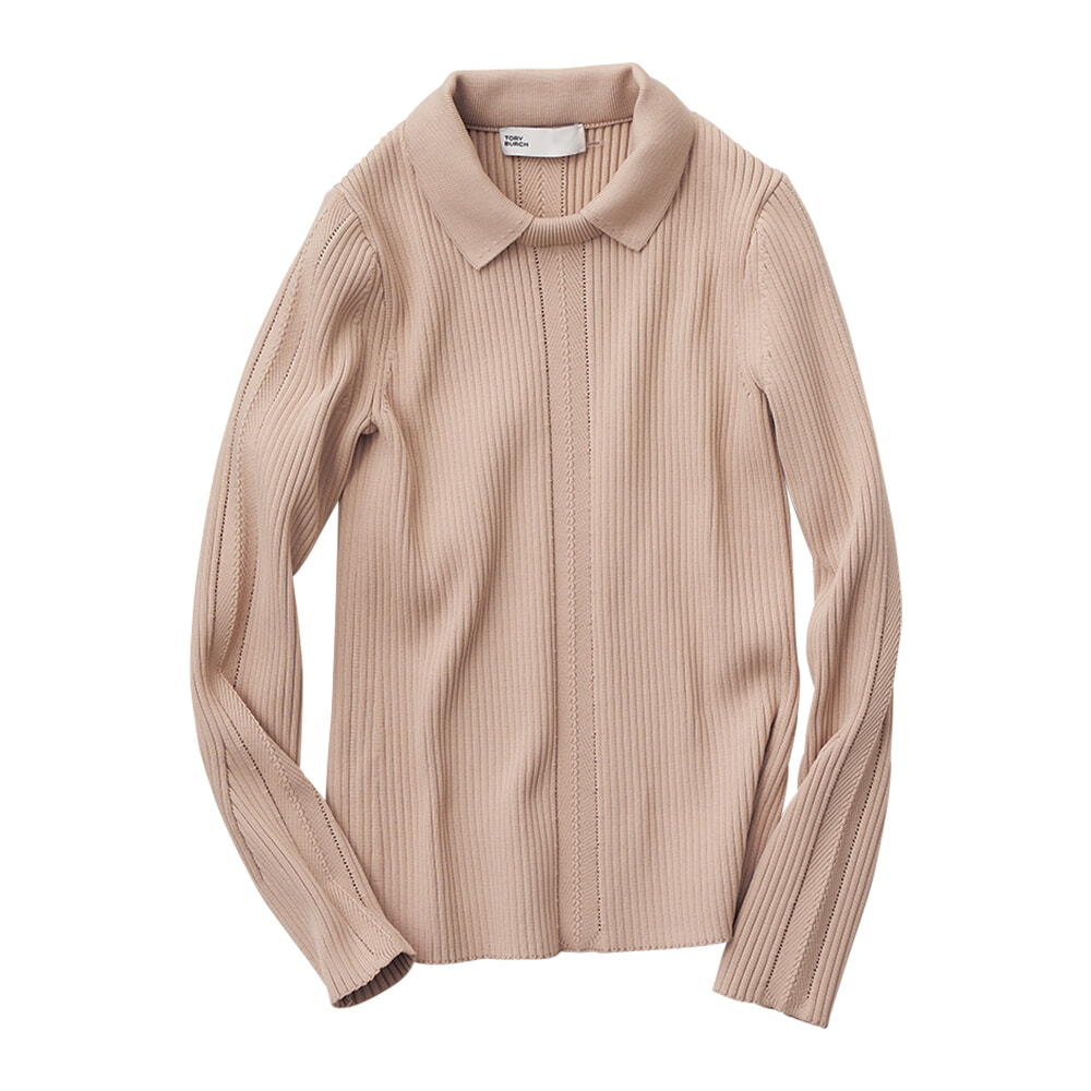 静かに主張するピンクカラー。裾にはさりげないアクセントも。