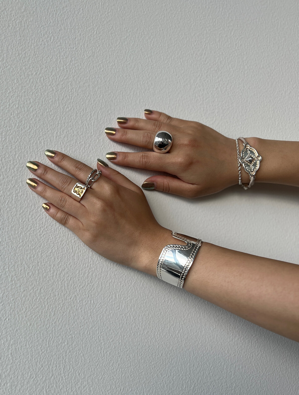 左手中指に着けたアルファベットのシグネットリング、繊細かつモダンなチェーンがポイントのリングの重ね付け、そしてインディアンジュエリー風のバングル、とマニッシュなテイストながらとても柔らかい印象も醸し出す。