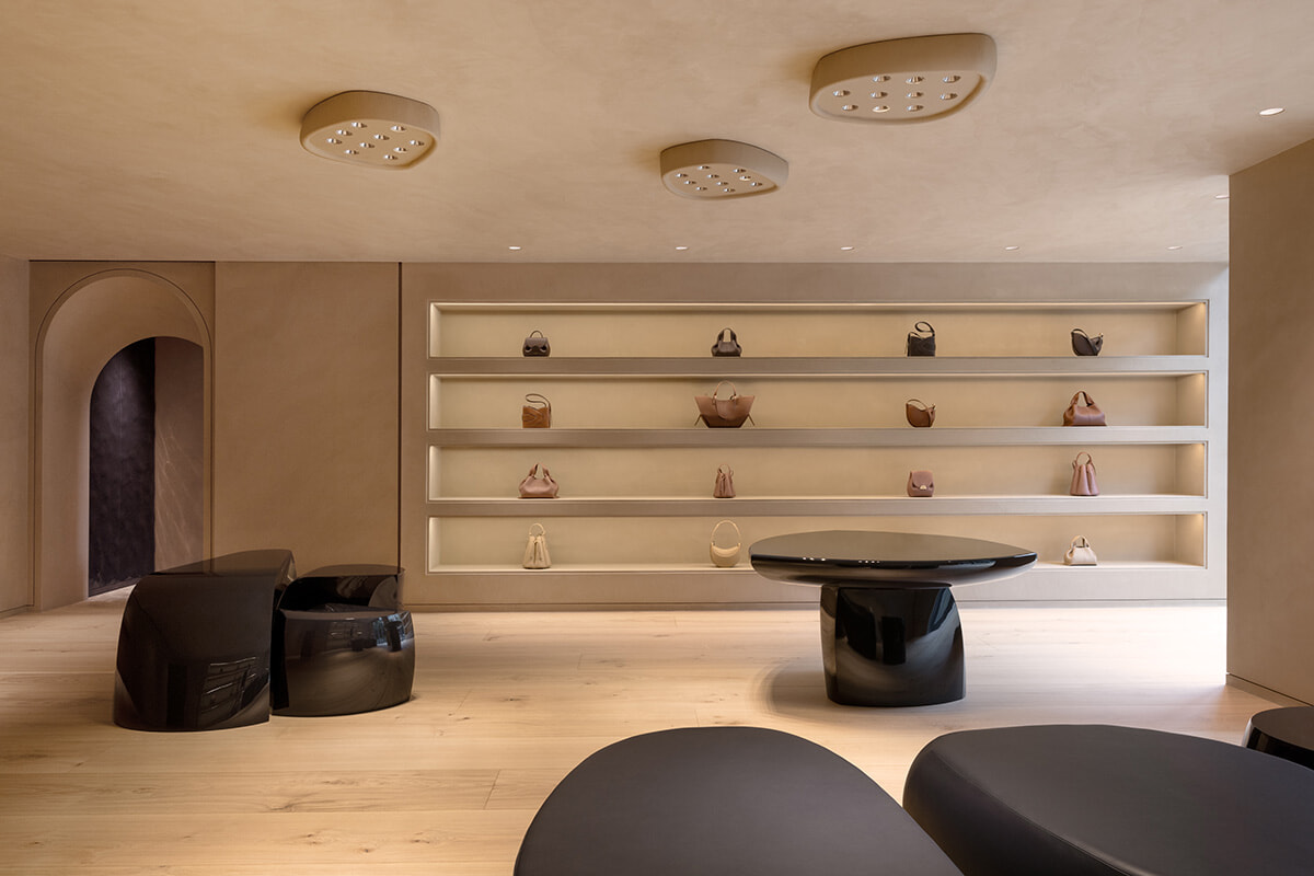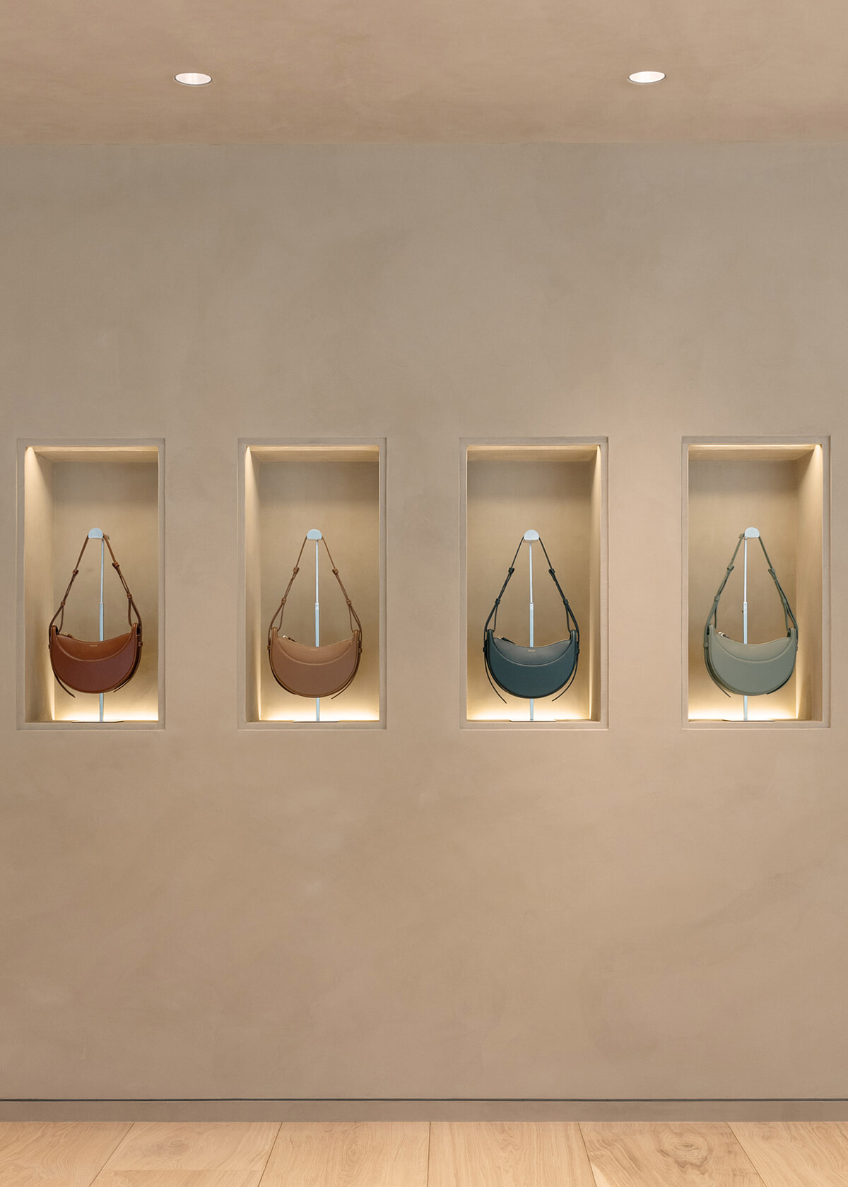 店内は天然のナラ材を床に使用し、これが空間に奥行きと軽さを与える一方、天井には革製の照明を複数配置。ポレーヌらしいカラートーンの砂漆喰で均一に仕上げられた壁が、店内に配置された深い藍色の什器とのコントラストを際立たせる。