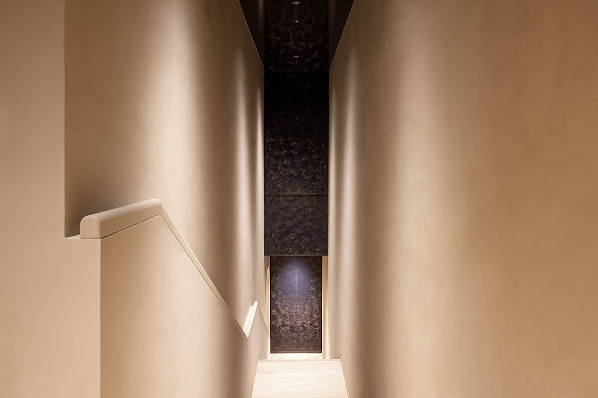 1階の奥に位置するアーチをくぐり、階段へと進むと目に入るのは、ガラスデザイナー、エマニュエル・バロワの巨大な作品。「海の層」を作り出す、ミッドナイトブルーのこのガラスパネルの作品は、階段の高さ全体を飾り、穏やかで瞑想的で優しさに満ちたひとときを提供するとともに、漆塗りの天井が空間の広がりをさらに強調している。