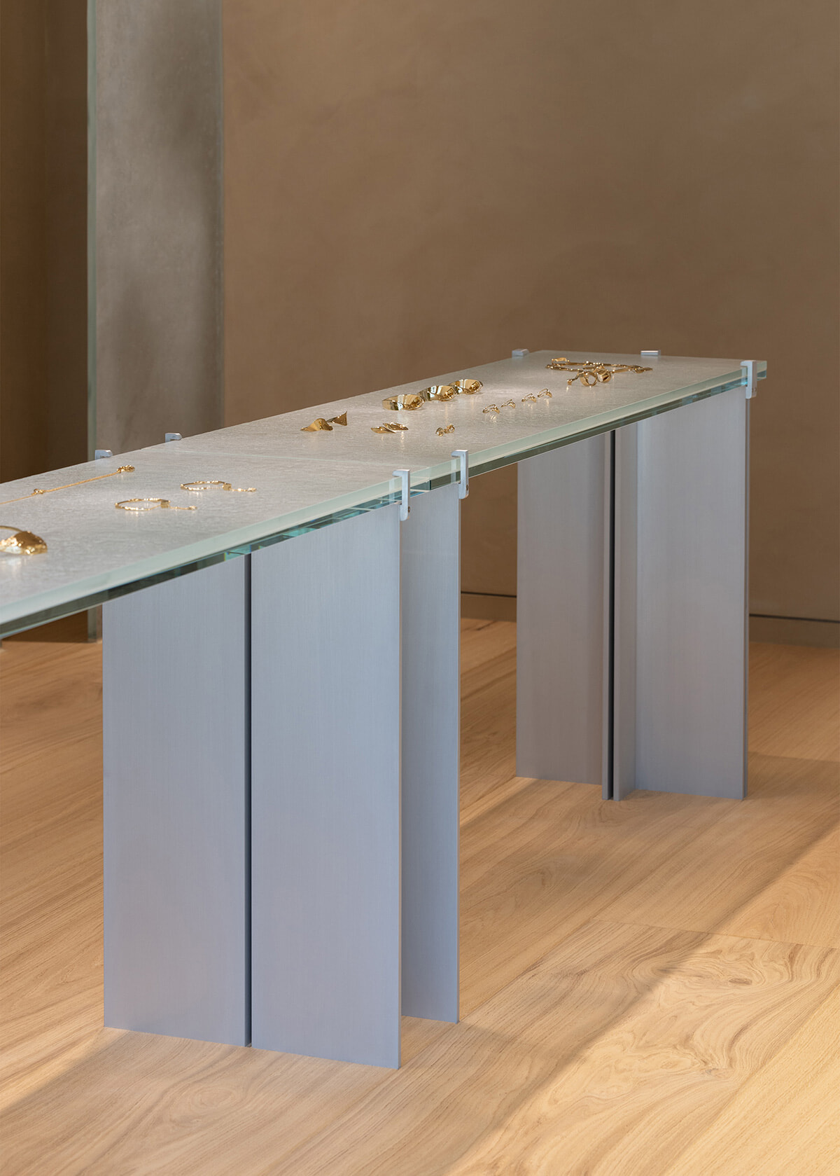 自然光がガラス窓から差し込む2階は、ジュエリーコレクションスペース。ここの壁にもエマニュエル・バロワによる特注のインスタレーション作品が飾られているのでぜひチェックして。