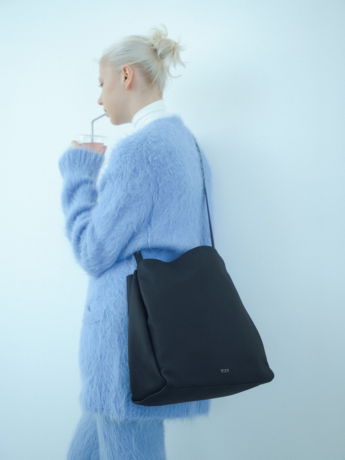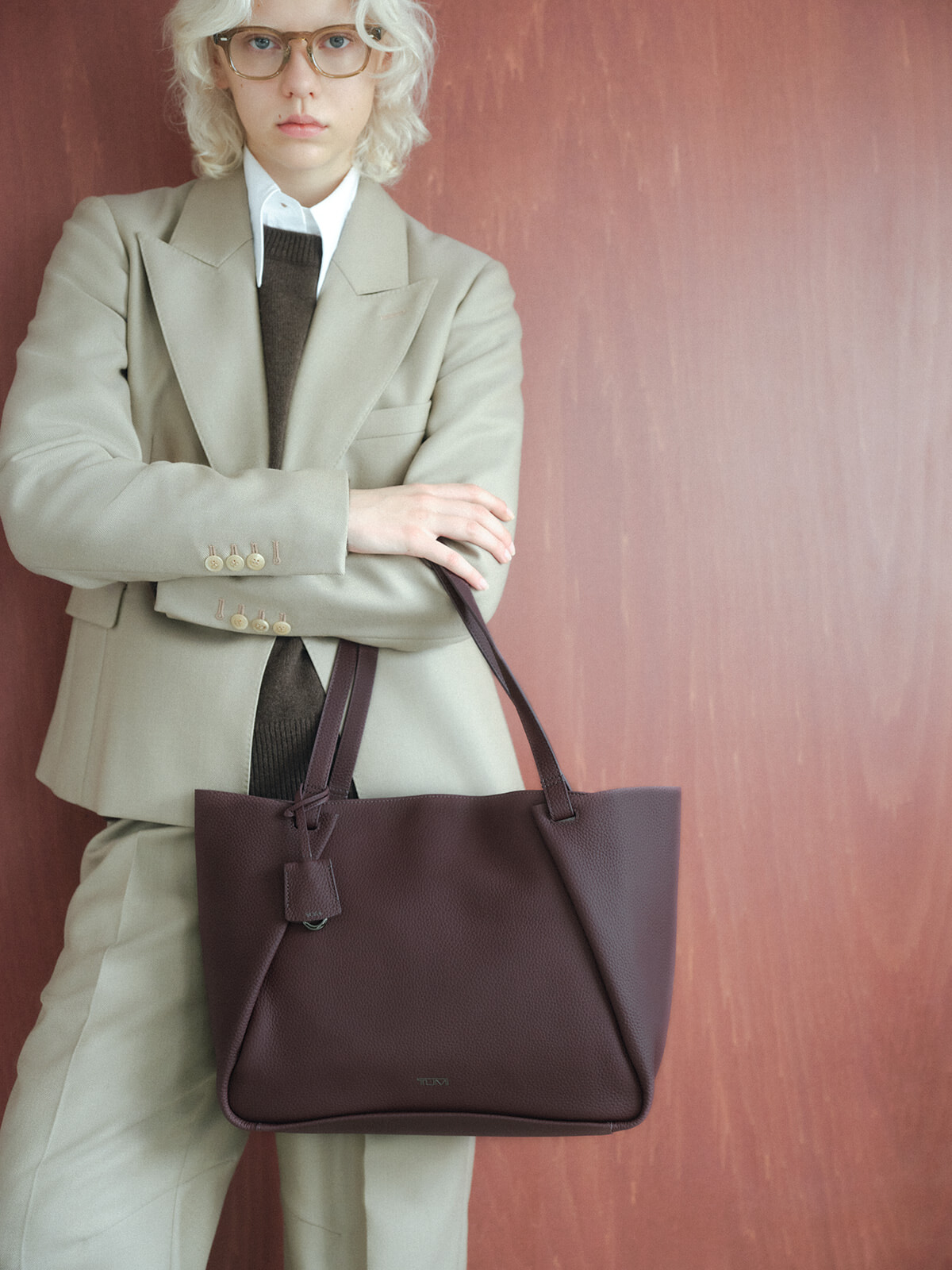 トートバッグ「ヴァロリー」(H28×W45.5×D12.75cm)¥121,000/トゥミ(トゥミ・カスタマーセンター) ジャケット¥97,900、パンツ¥59,400/ともにフォトコピュー(ショールームリンクス) シャツ¥30,800/テラ(ティースクエア プレスルーム) ニットトップ¥196,900/クリスタセヤ(ビオトープ) 眼鏡¥19,800/ザベッドフォードホテル(キングスター)