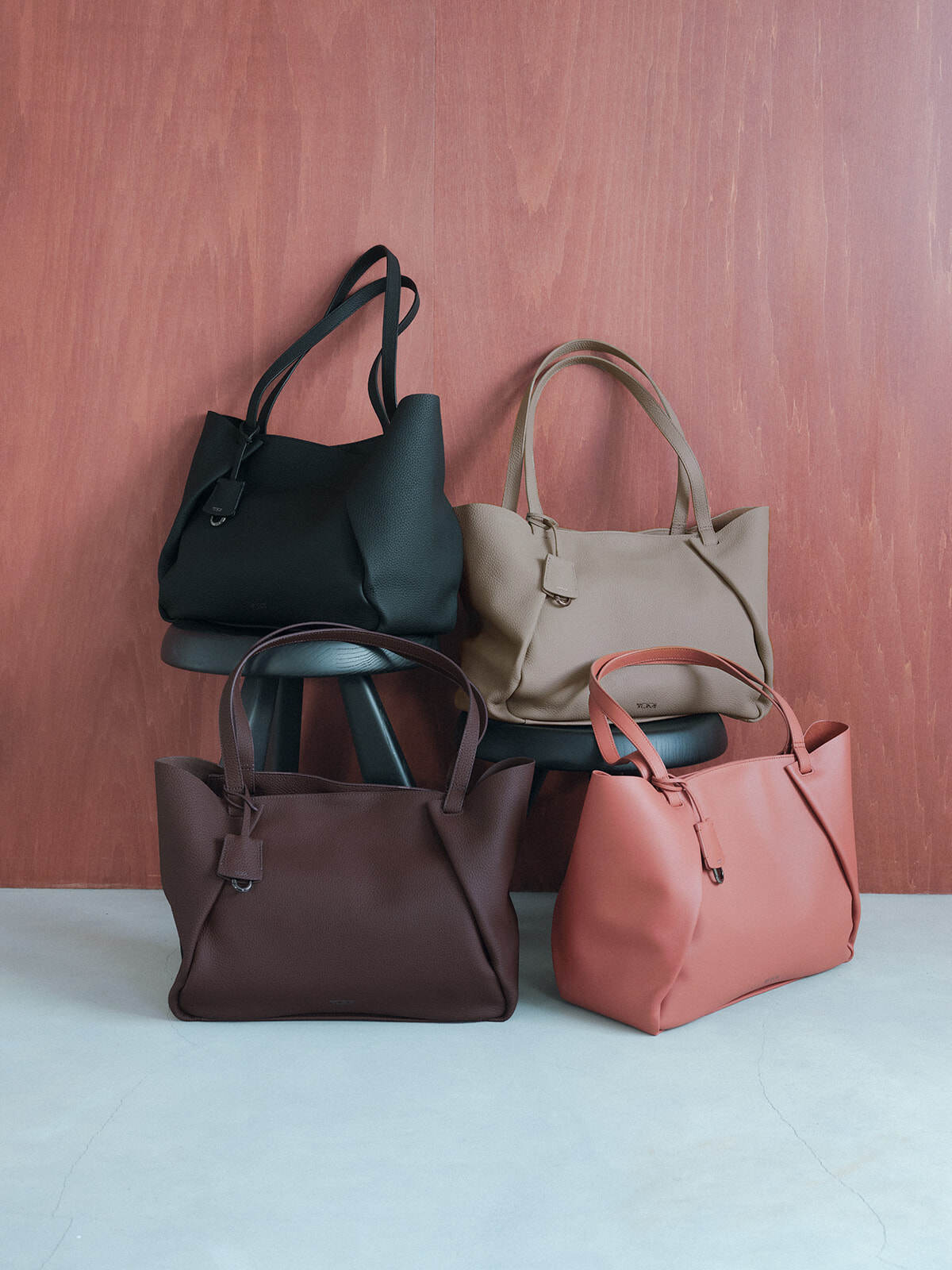 カラーラインナップは、ブラック、トープ、ディーププラム、テラコッタの全4色で、テラコッタのみシボのないスムースレザーを使用。洗練されたシックな色合いは、季節を問わずどんなスタイルにも映える。