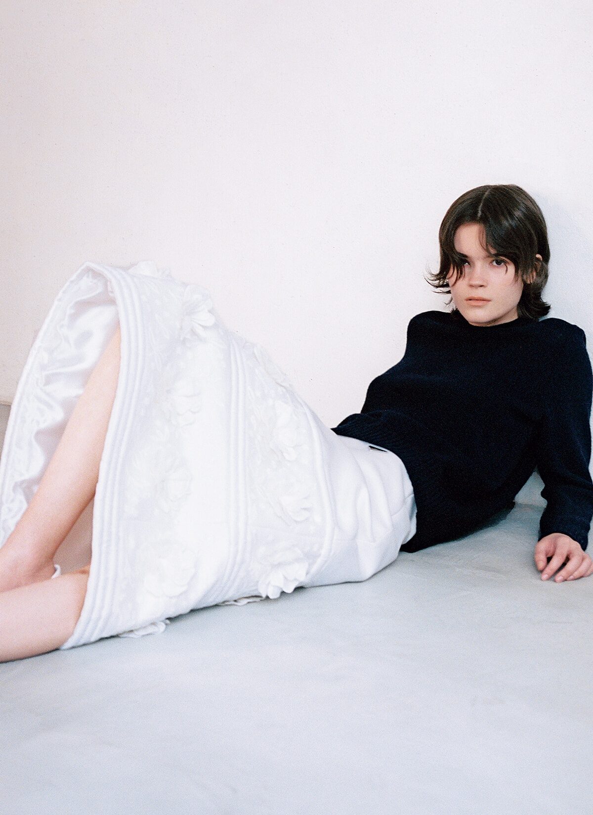 アーチ状に広がる純白のスカートと咲き誇った花々が連想させるのは、愛情の証であるイヴニングウエア。そのエッセンスを加えることで、今シーズンのプラダは手仕事による心遣い、そして生きることの美しさを再考。合わせたのはデイリーなセーター。意義は違えど不可欠な存在が、お互いの重要性を高め合う。