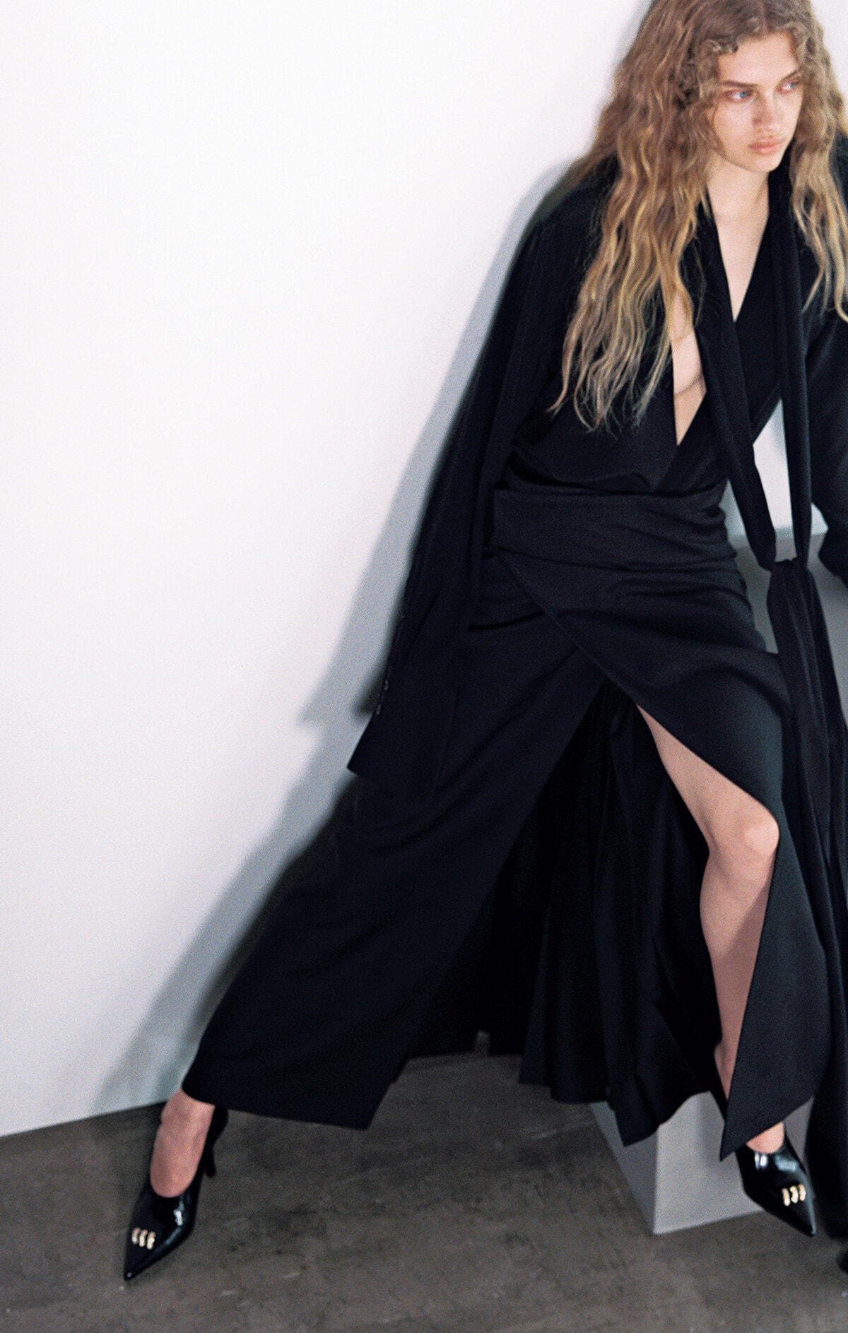 時にしめやかに、時に大胆に。仕草ひとつで印象を変えるラップスカートは、上質なウールがエレガンスを引き立てる。長いボウタイがセンシュアルに揺れるシャツを合わせたルックが彷彿とさせるのは、ユベール・ドゥ・ジバンシィがデビューコレクションで発表し、当時としては斬新だった“セパレーツ”スタイル。