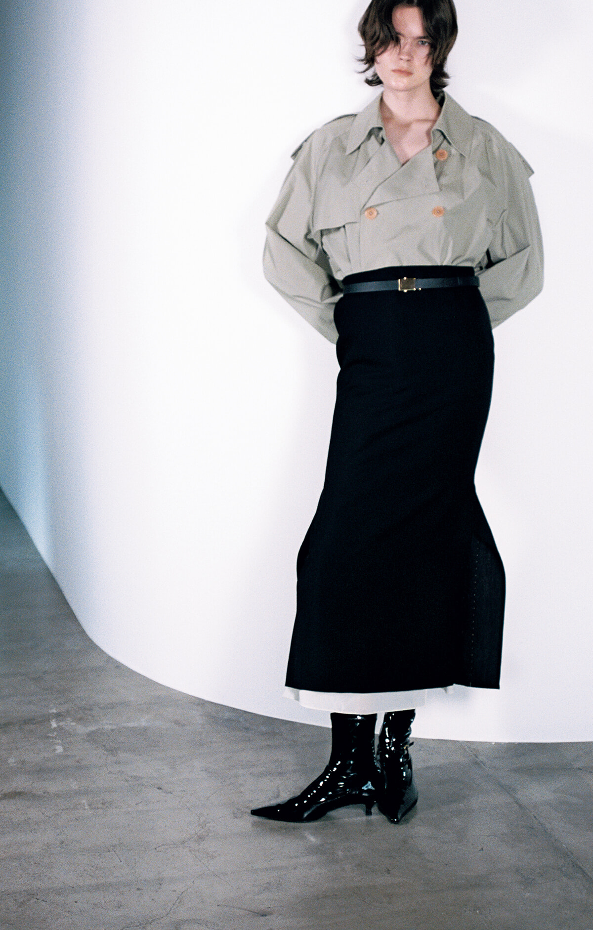 最高級のウールモヘア生地とサイドスリットに施された白いハンドステッチに、哲学として持つサヴィルロウのテーラリングを感じるペンシルスカート。クラシックなトレンチコートをタックインし、裾先からはシルクのインナースカートを覗かせることで、厳格なブリティッシュスタイルに遊び心を添えた。