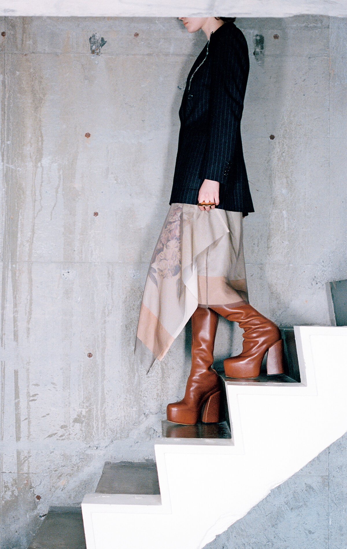 繊細なフラワーモチーフがプリントされたスカートに込められたのは、色褪せた大判スカーフを切り、チュールを重ねることで、まったく別の一着として新たな命が吹き込まれたというストーリー。長い年月着続けたためにラペルの端が擦り切れてしまったかのようなマスキュリンなジャケットとともに、服と着る人との間に生まれる親密な瞬間を描いた。