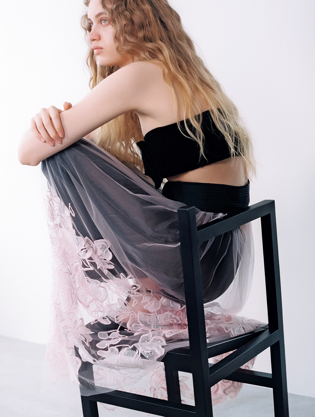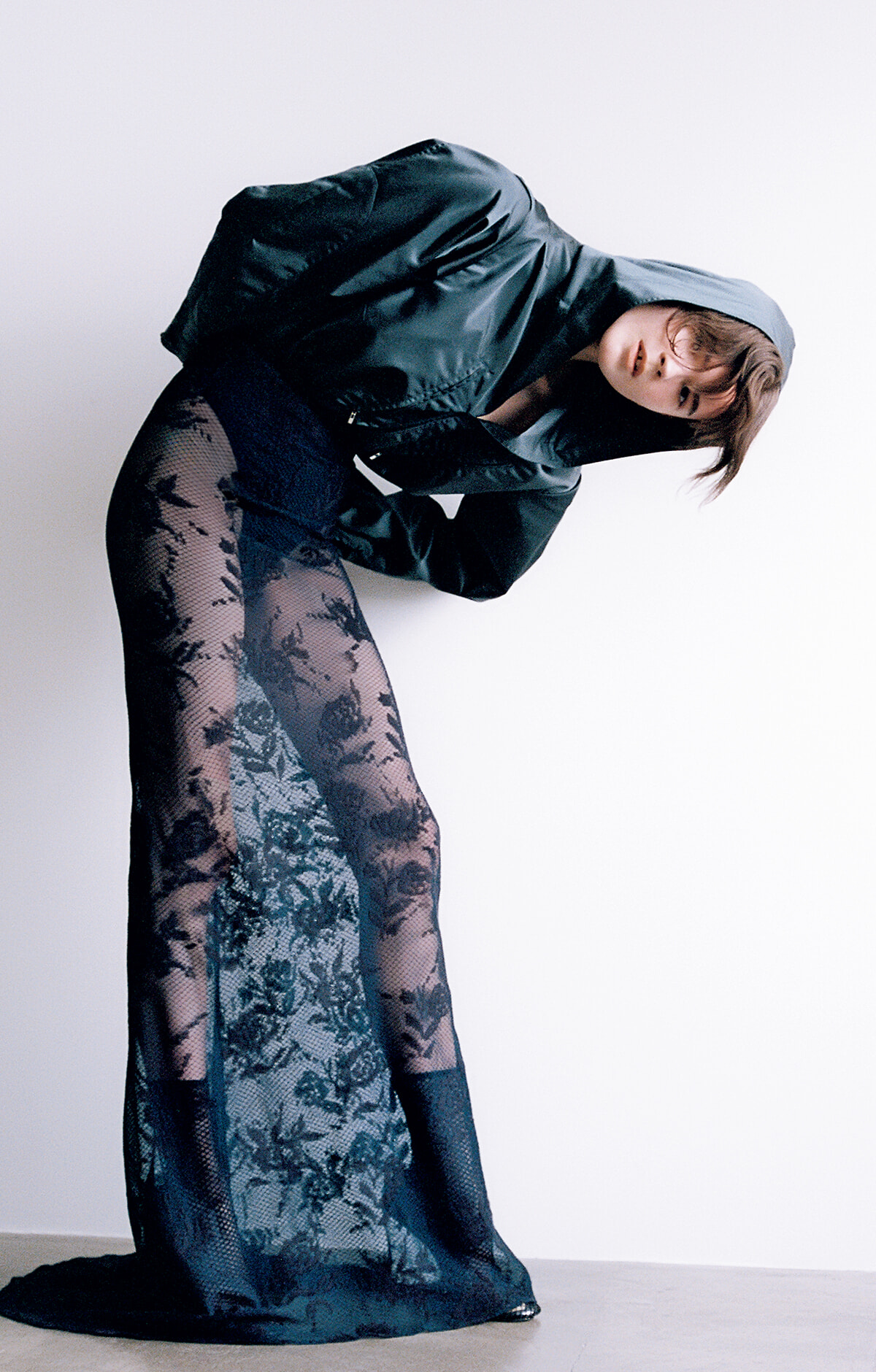 ふわりと膨らむシルエットと光沢のある質感が目を引くフード付きボディシャツに合わせた、身体にぴったりとフィットするフルレングスのレーススカート。繊細なコットンメッシュにインターシャ編みで施されたローズ柄、その先にうっすらと透ける素肌が、女性だけが持つ曲線美を浮かび上がらせる。