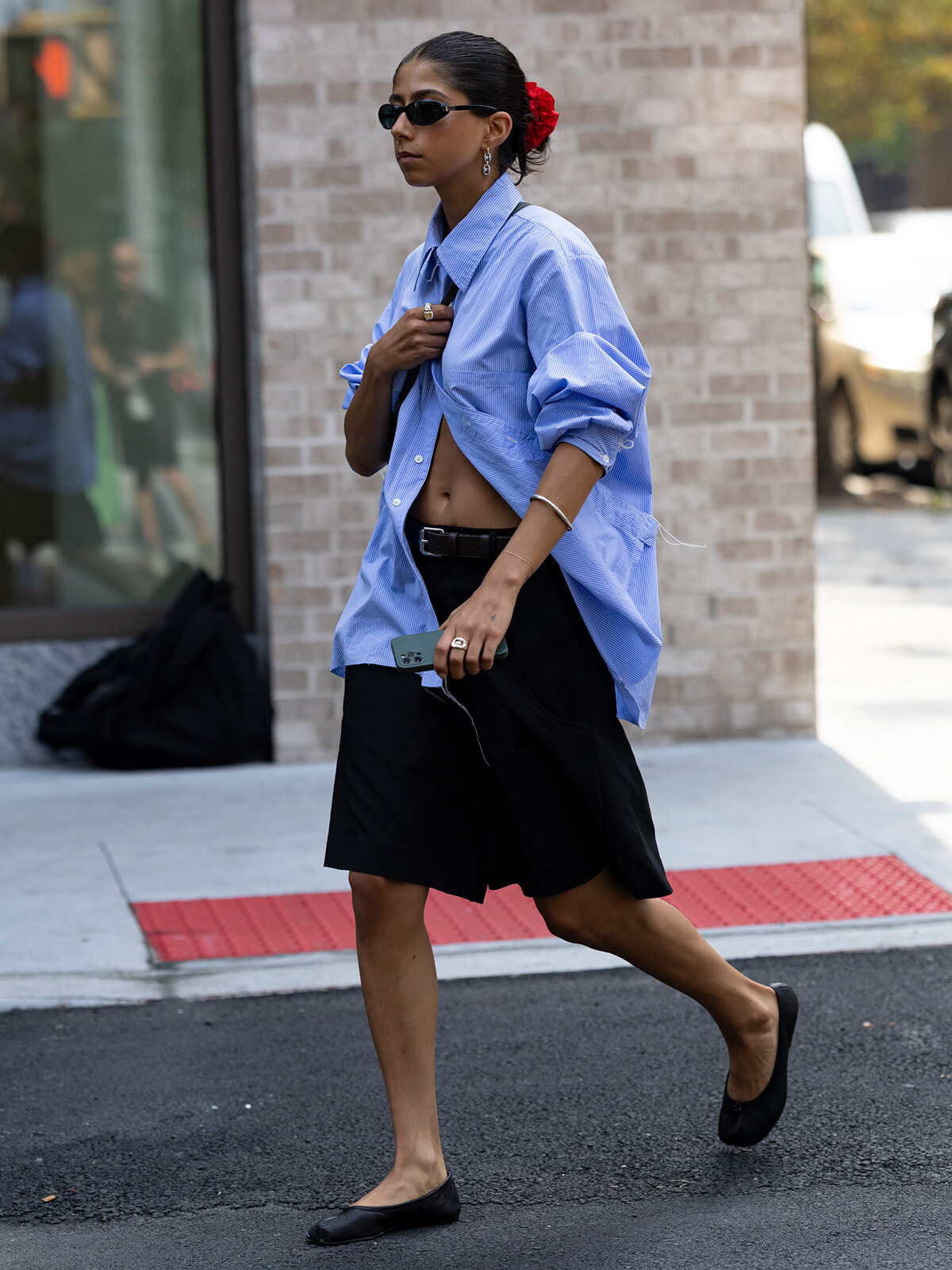 NYで見かけたこちらの方は、オーバーサイズのシャツとショーツ。シュシュやバレエシューズなど、フェミニンな小物を加えてボーイッシュになり過ぎるのを阻止している。シャープなサングラスや、シャツのボタンを大きく開けて肌を見せているのも効果的。