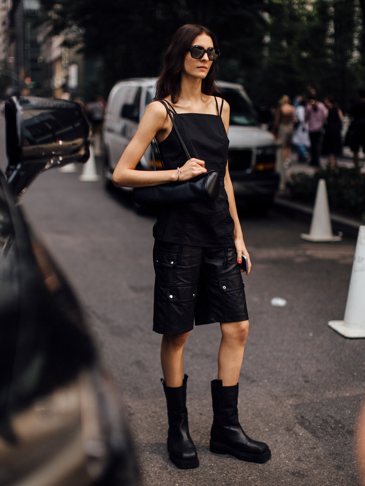 最後はオールブラックでクールにまとめた方。ショーツもレザーを選ぶとシャープな印象に。こちらも華奢なストラップのトップでフェミニン要素をプラスしている。