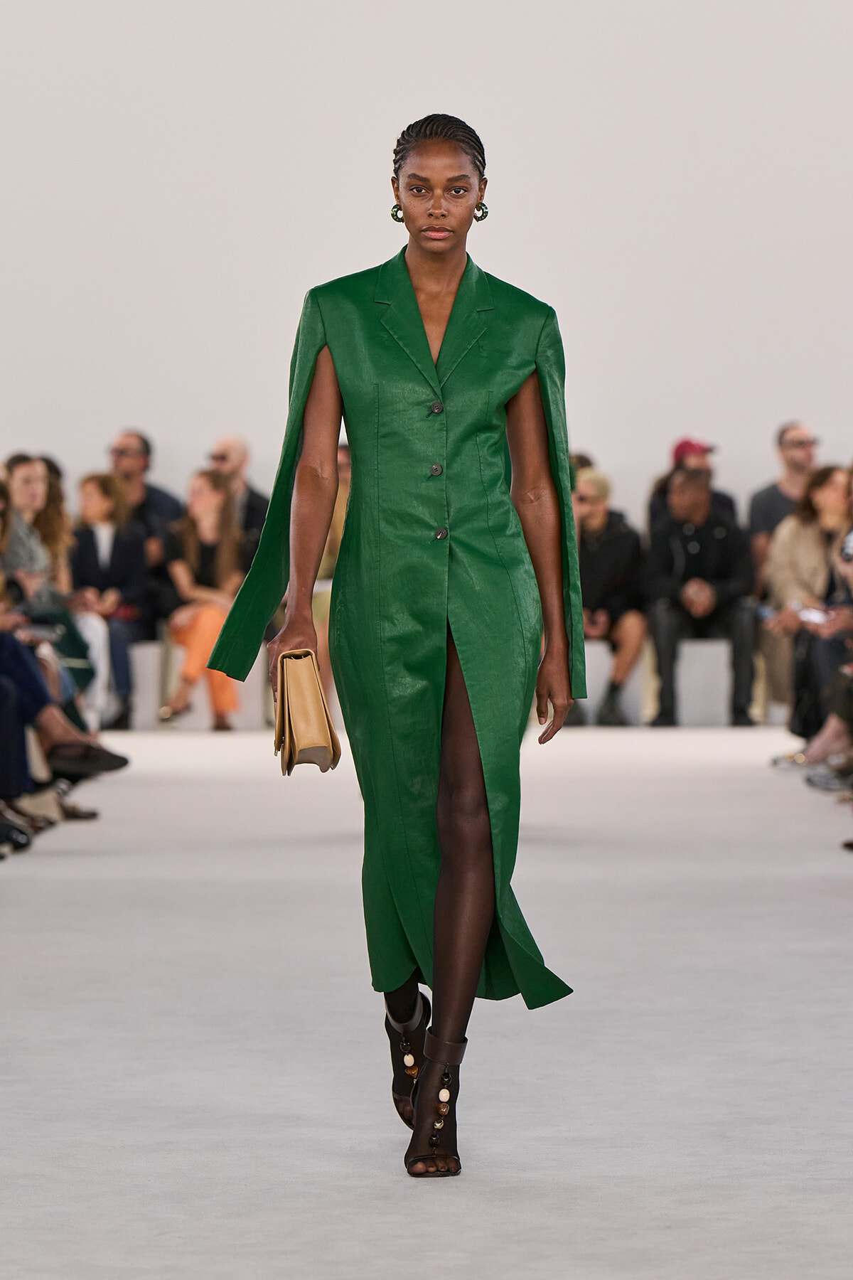 天然素材をサテンにボンディングしたケープは、今季を象徴する1着。また、フェラガモのブランドカラーである赤に代わって、今季はグリーンが多用されているのも特徴的。