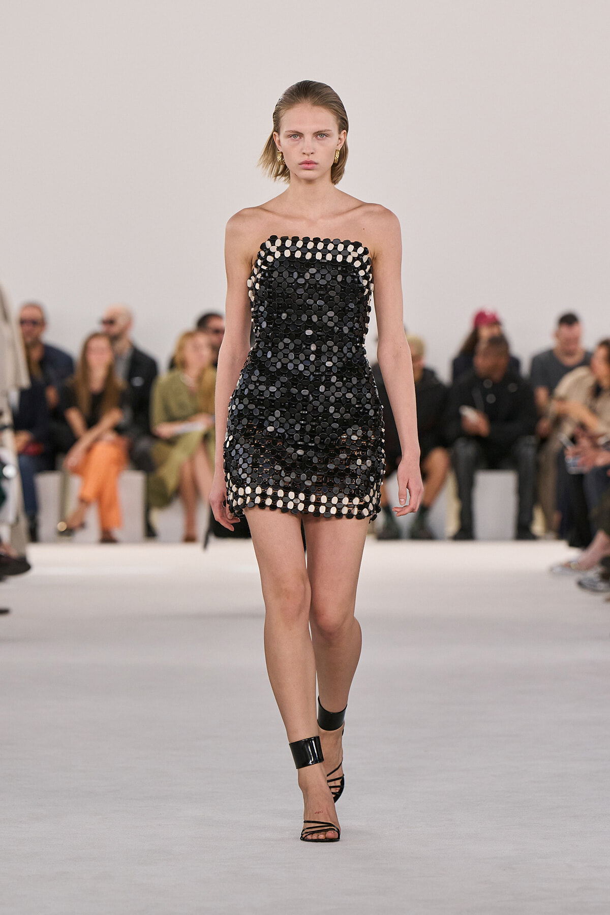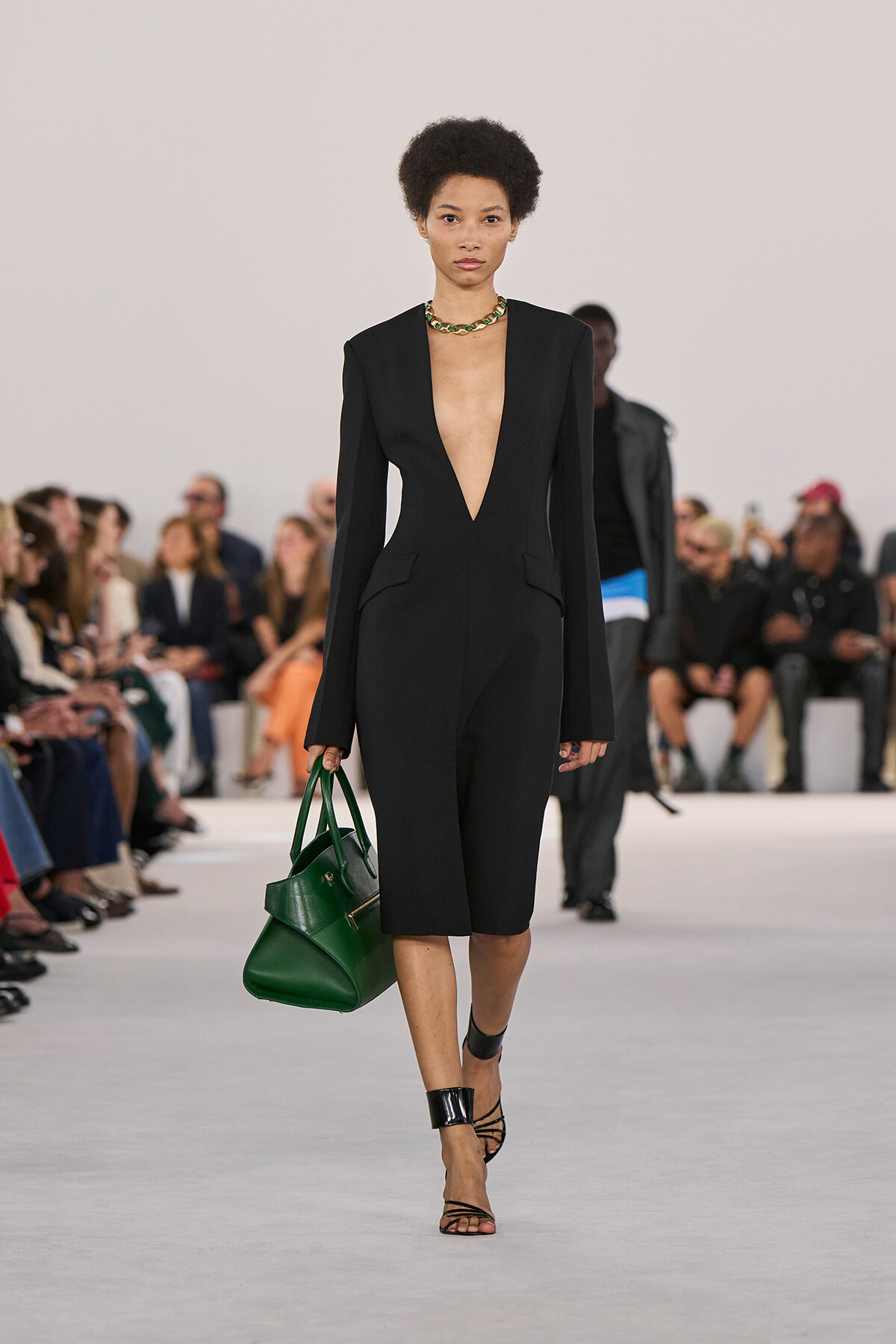 テーラードジャケットのラペルを取り払い再構築したようなブラックドレスの深く開いた胸元に、マクシミリアン・デイヴィスのフェティシズムが光る。デイリーに使えるバッグや、太いアンクルストラップがアクセントになったサンダルなど、アクセサリー使いも気になる。