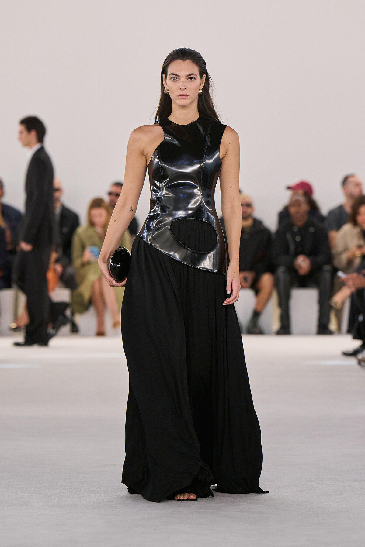 甲冑のようなディテールが目を引く、ドレープの美しいドレス。リラックスしたムードと厳格さの共存がここにも見られる。