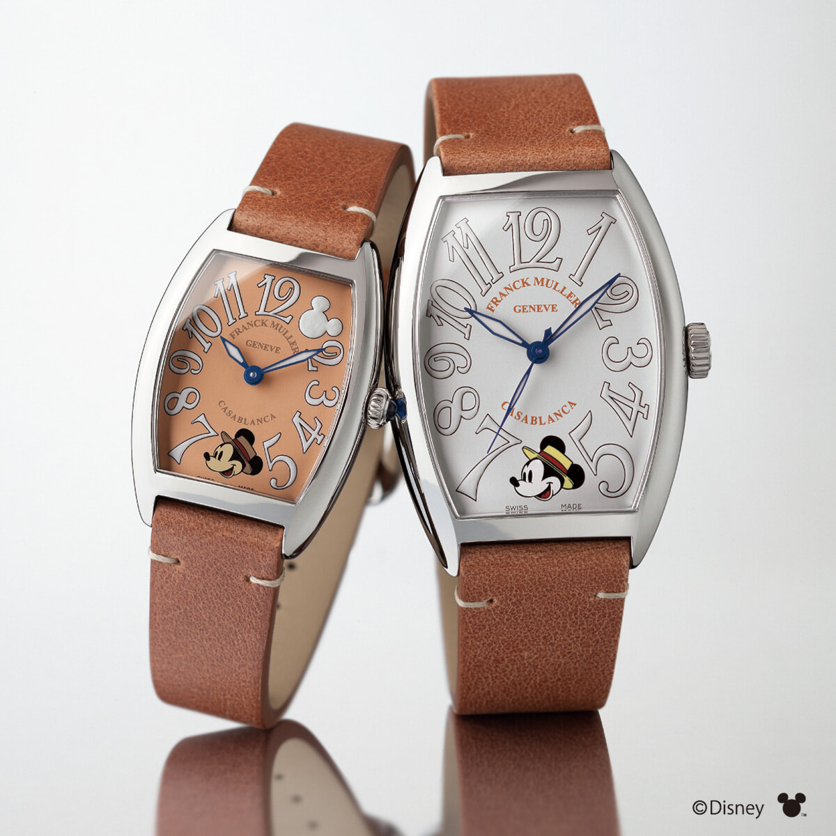 今回の「ディズニーコレクション」では、6時位置に旅の装いをしたミッキーマウスを配置。クオーツモデルでは1時位置にミッキーがこっそりと紛れているのもポイント。左:ウォッチ「カサブランカ」(SS、35×25mm)¥1,265,000(2色展開、各色50本限定、10/20発売) 右:ウォッチ「カサブランカ」(SS、45×32mm)¥2,035,000(2色展開、各色50本限定、10/20発売)/ともにフランク ミュラー(フランク ミュラー ウォッチランド東京)