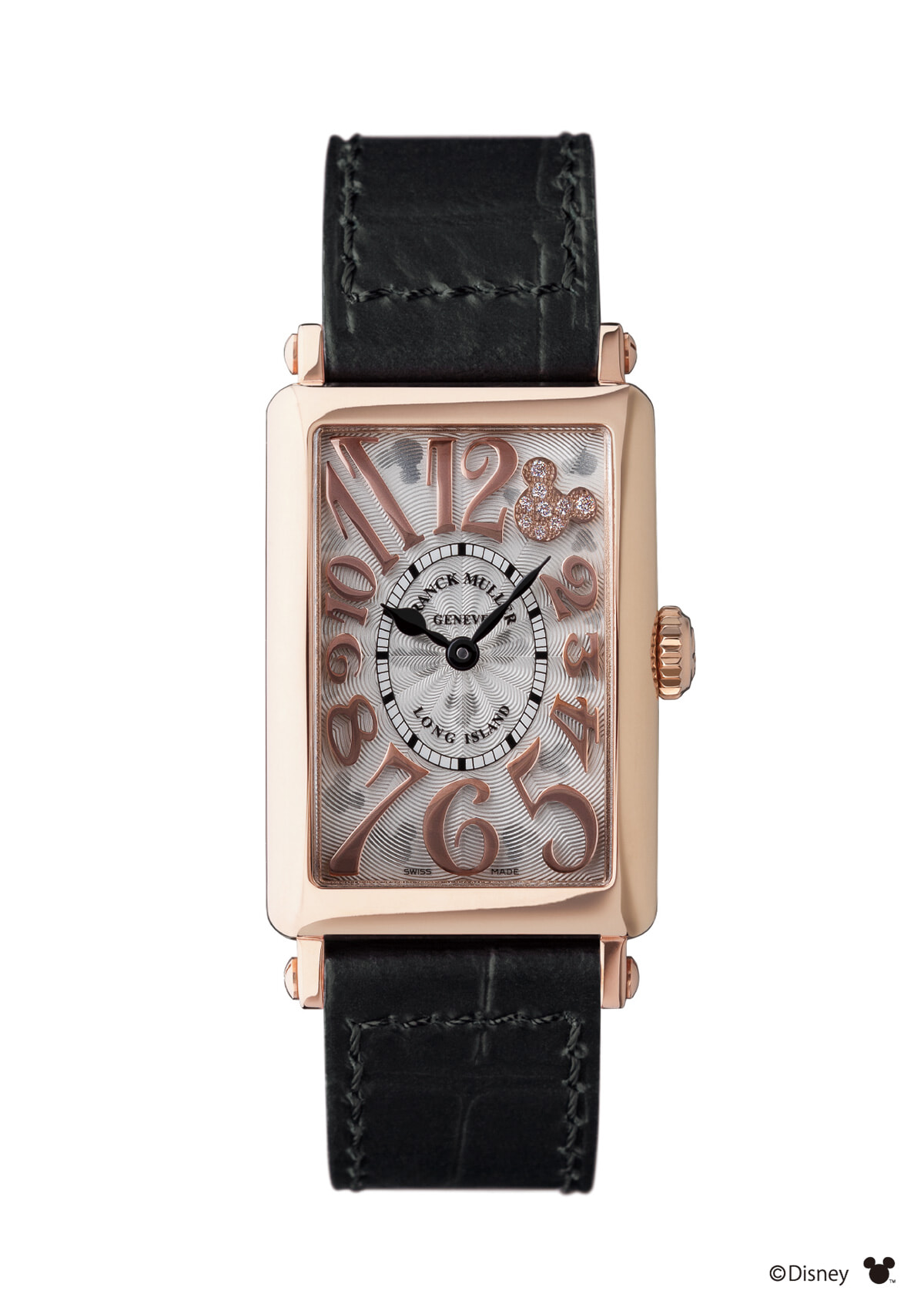 1時位置にダイヤモンドを並べたミッキーを配置。また文字盤全体にもミッキーの透かし彫りがちりばめられている。ウォッチ「ロングアイランド」(18KPG、32.5×23mm)¥2,860,000(50本限定、10/20発売)/フランク ミュラー(フランク ミュラー ウォッチランド東京)