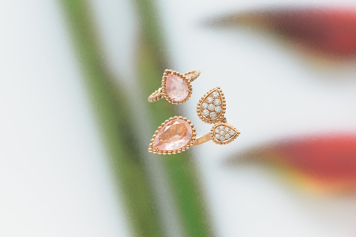 「セルパンボエム 3モチーフ リング」(ピンククオーツ×PG×ダイヤモンド) ¥1,214,400、「セルパンボエム リング スモール」¥268,400(ピンククオーツ×PG)/ともにブシュロン(ブシュロン クライアントサービス)