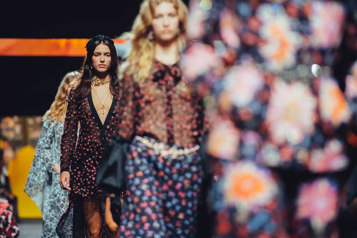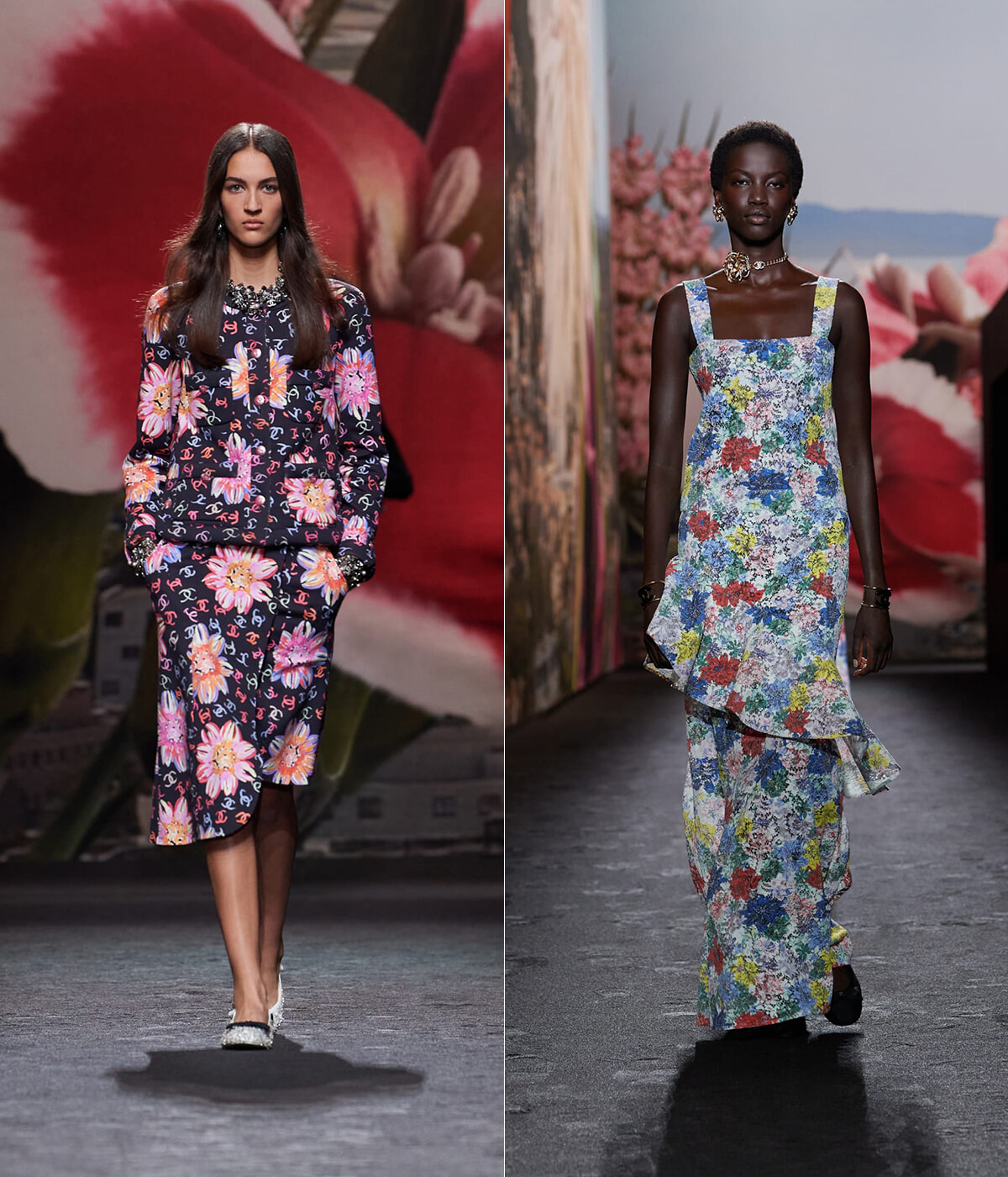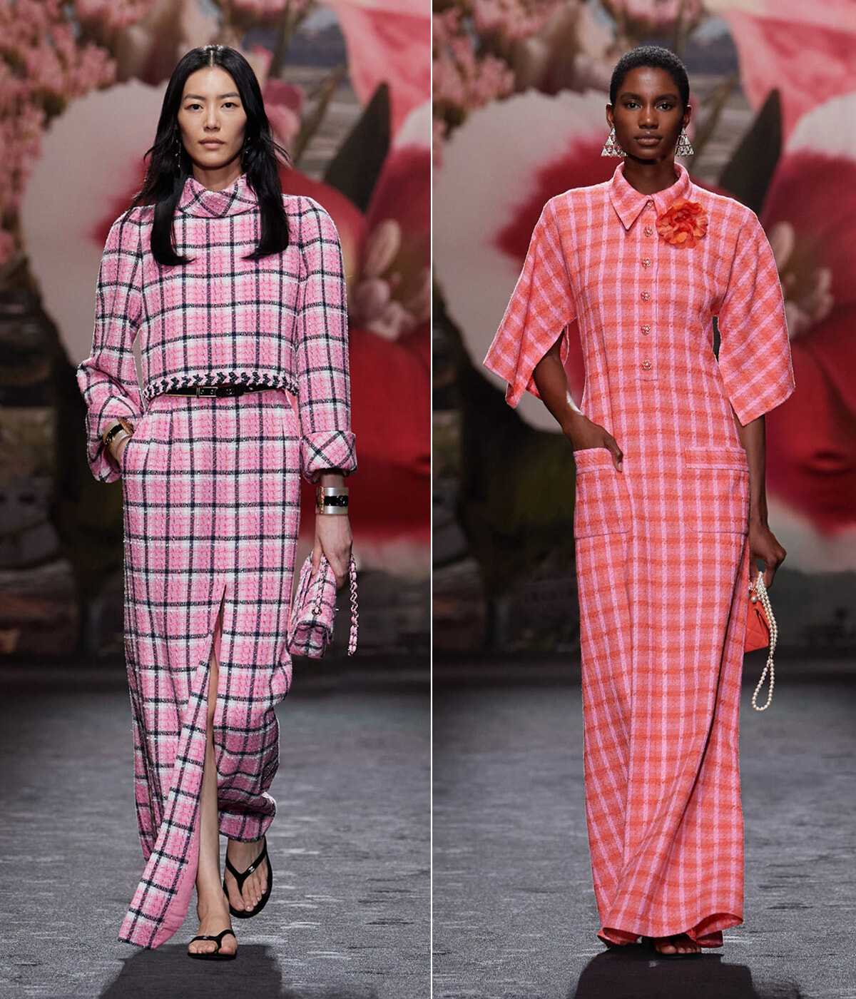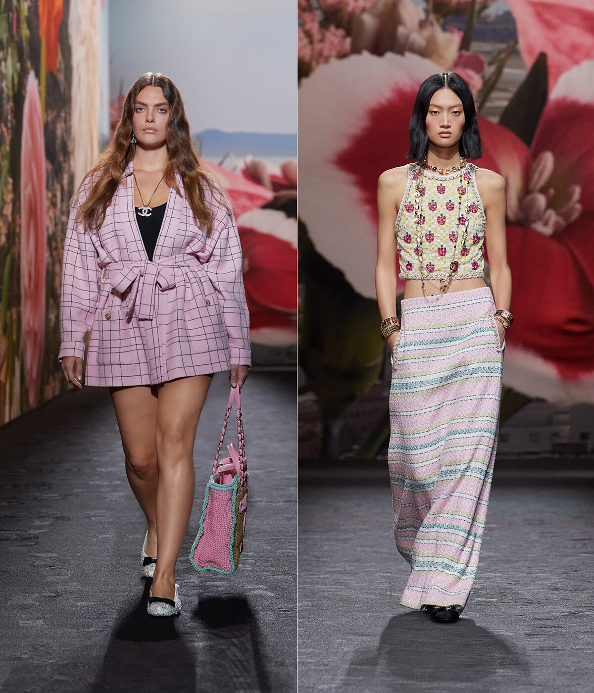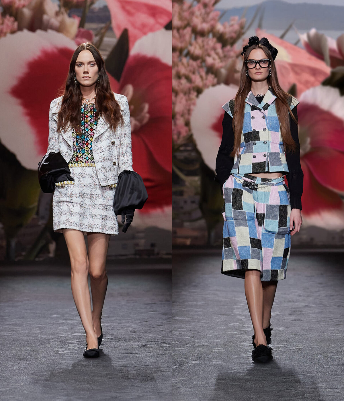 キュビズムの影響を受けたとされるヴィラ ノアイユのチェッカー模様は、柄やモザイクのようなディテールとして取り入れられた。モノトーンからパステルまで、カラフルな色合いで表現されたチェック柄を活かしたスーツも目を引く。さらに邸宅の庭に咲く花々を模した高揚感のある花柄もコレクションのアクセントに。