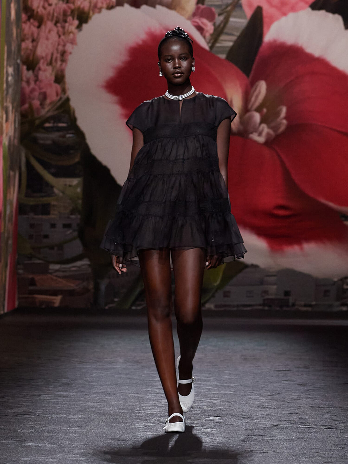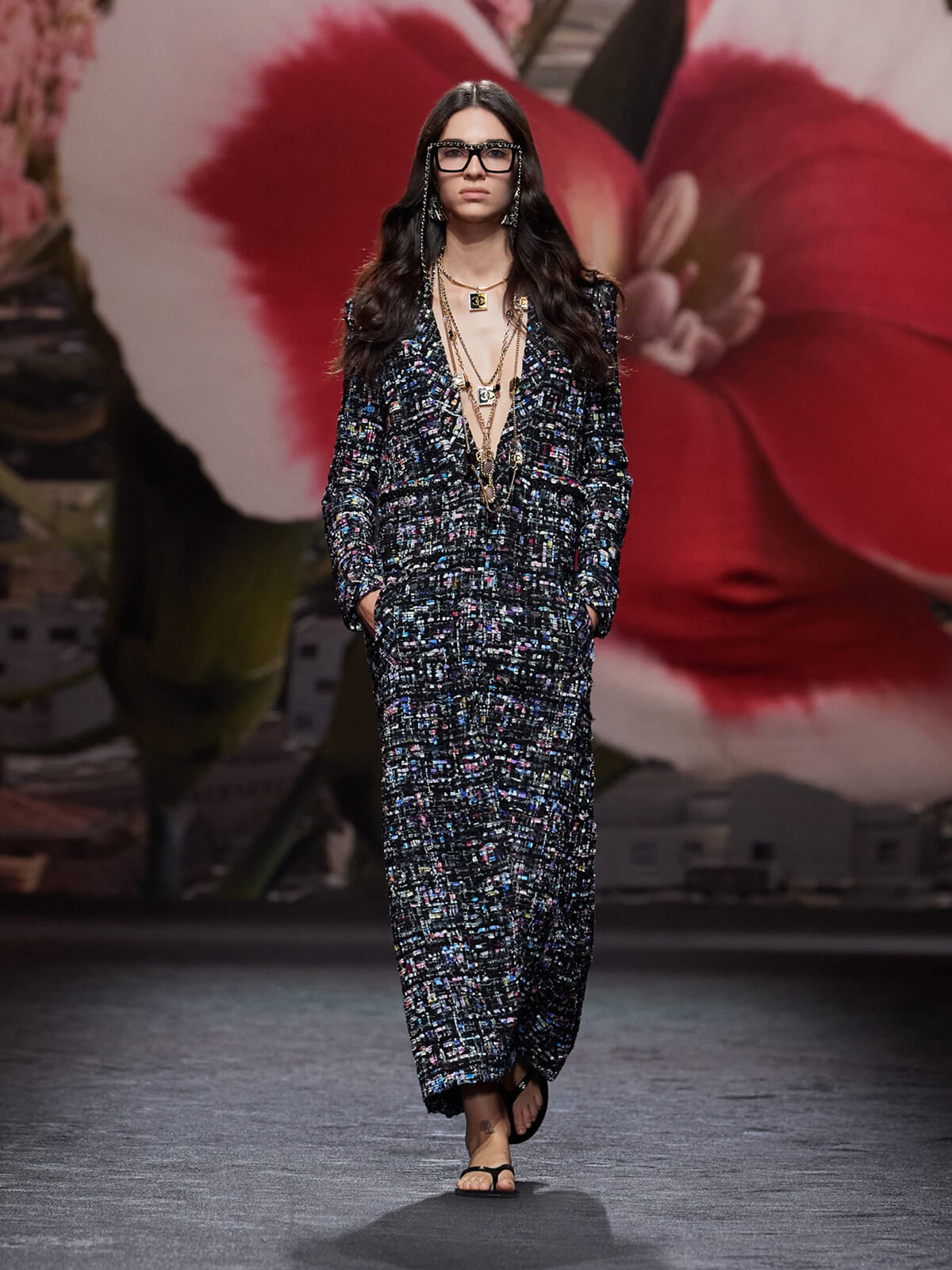 ショーの幕開けを飾ったのは、メゾンのDNAであるツイードが主役のドレス。アヴァンギャルドなヴィラ ノアイユの建築のラインを想起させるグラフィカルなツイードがモダン。足元にはフラットシューズを合わせて、クラシカルなイメージのあるツイード素材を軽快なムードに仕上げた。