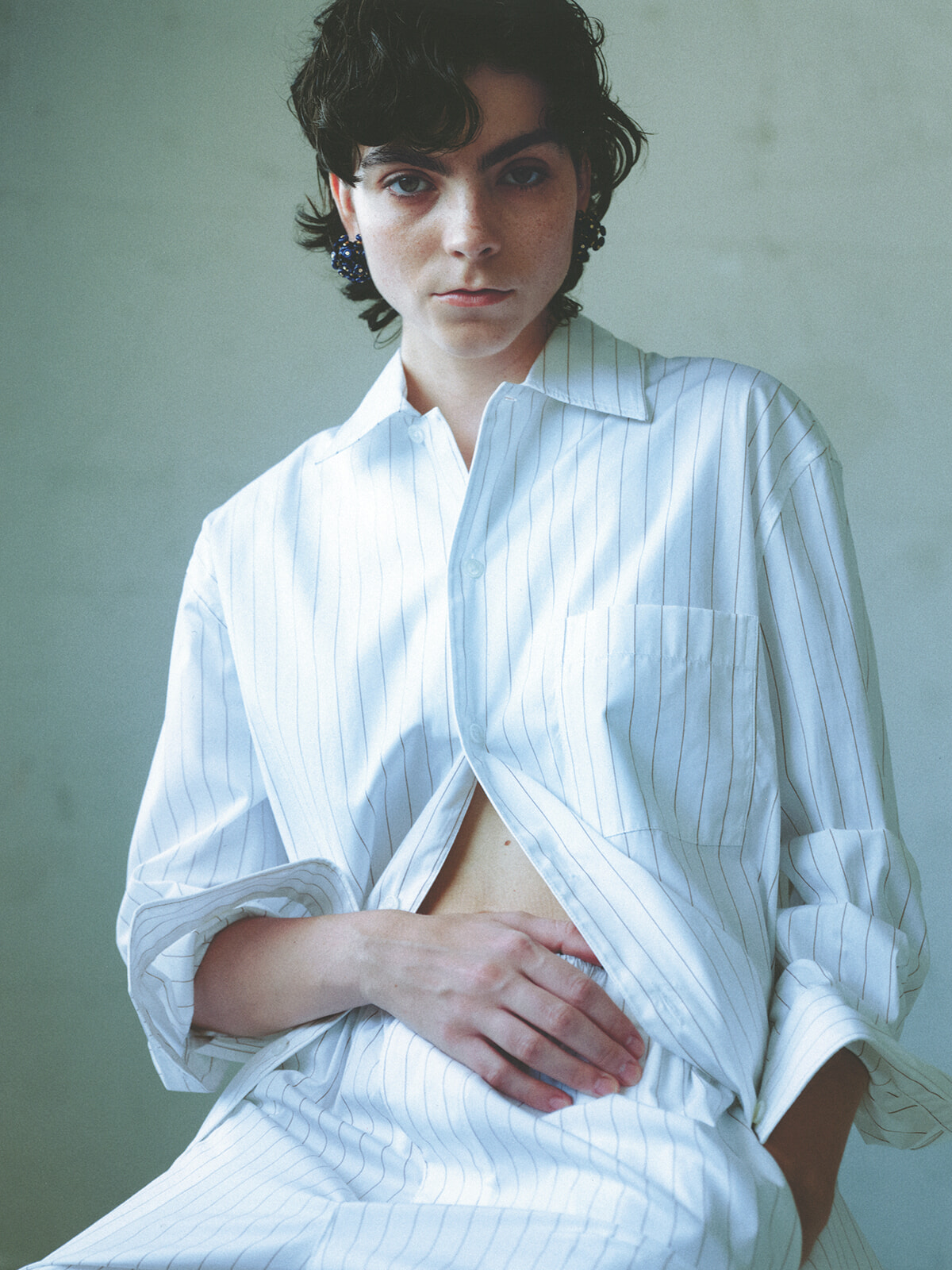 シャツ¥132,000、パンツ¥88,000、イヤリング(参考商品)/以上ボッテガ・ヴェネタ(ボッテガ・ヴェネタ ジャパン)