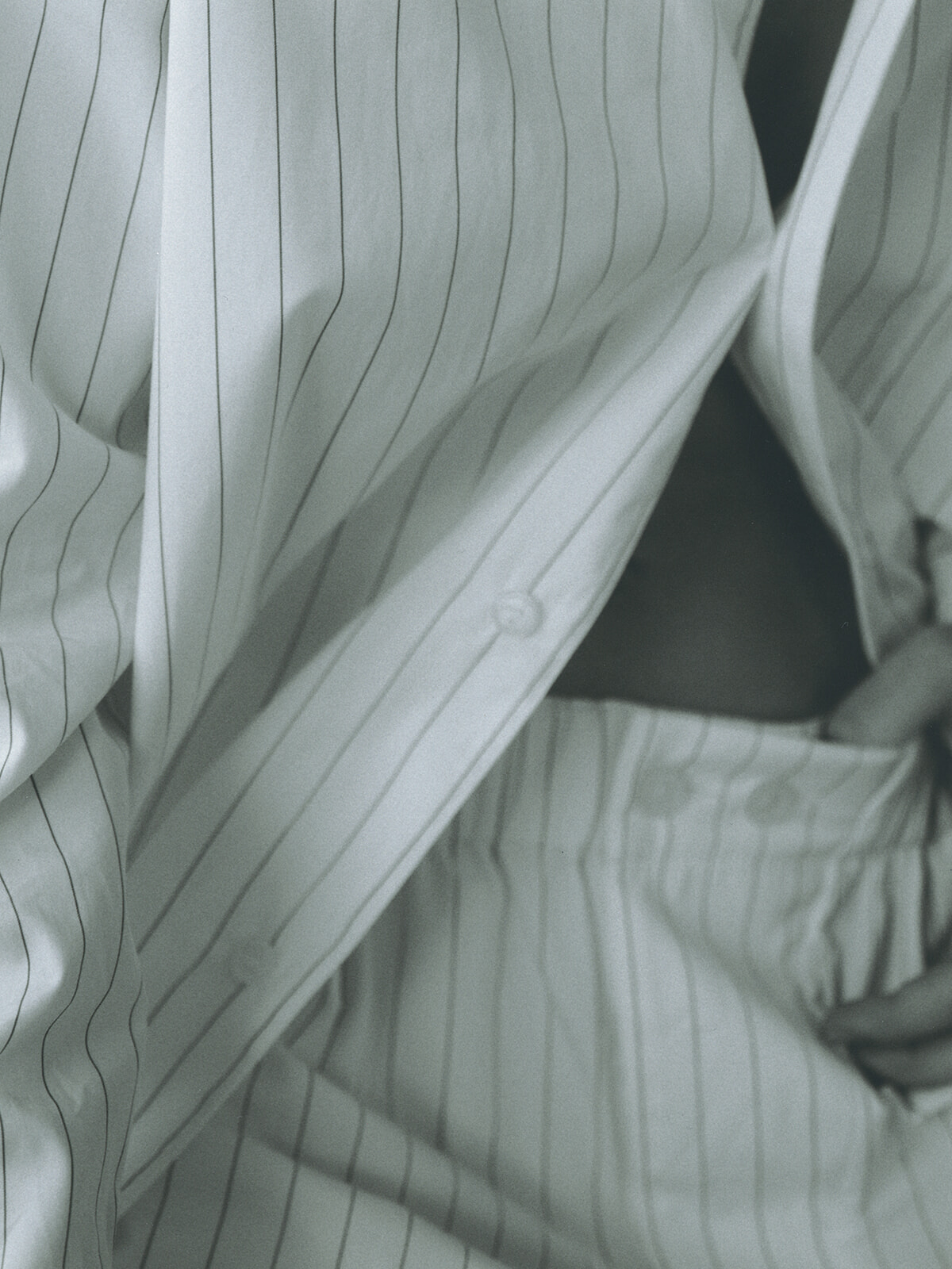 静かな力強さが宿るピンストライプのナイトシャツ。中で身体が泳ぐリラックス感のあるシェイプで、窮屈とは無縁。ボタンはあえてふたつしか留めずに、袖をロールアップさせて、同生地のショーツを合わせたヘルシーな装いを楽しみたい。