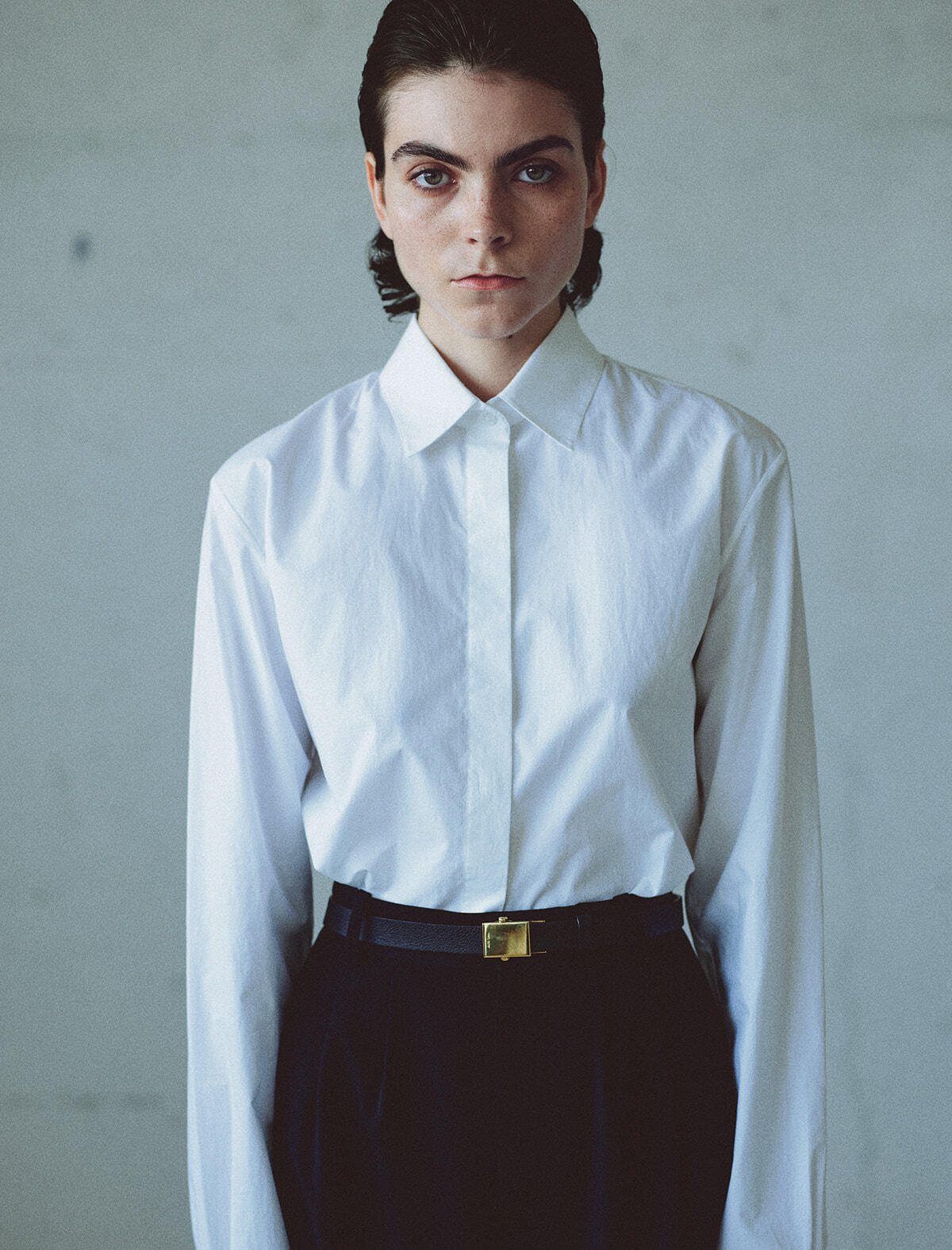胸ポケットまで削ぎ落とした、禁欲的に美しい一枚。凛としたモダニティが宿るシャツは、着るだけで背筋がすっと伸びる。ボタンが隠れるよう比翼にした前立てをはじめ、細部までにこだわり抜いた仕立て。