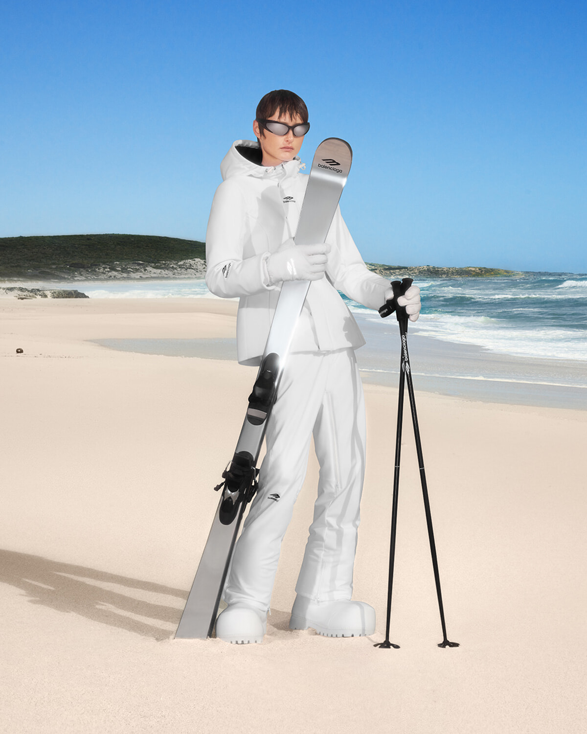 「3B スポーツ アイコン スキー アワーグラス パーカ」¥602,800、「3B スポーツ アイコン スキー グローブ」¥68,200、「3B スポーツ アイコン スキー カーゴパンツ」¥397,100、「アラスカ ローブーツ」¥169,400、「スキー」¥798,600、「スキーポール」¥56,100、「リバース Xパンダー レクタングル サングラス」¥69,300(以上11/15発売)/以上バレンシアガ(バレンシアガ クライアントサービス) ©️Courtesy of Balenciaga