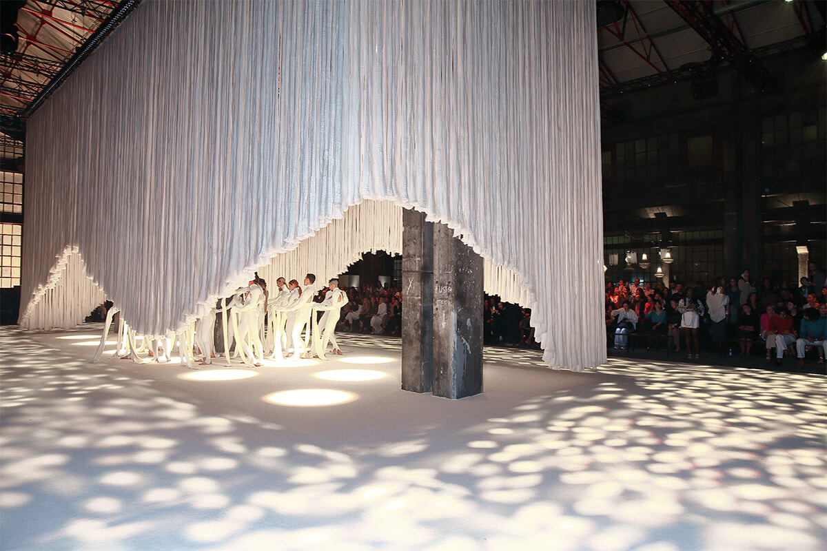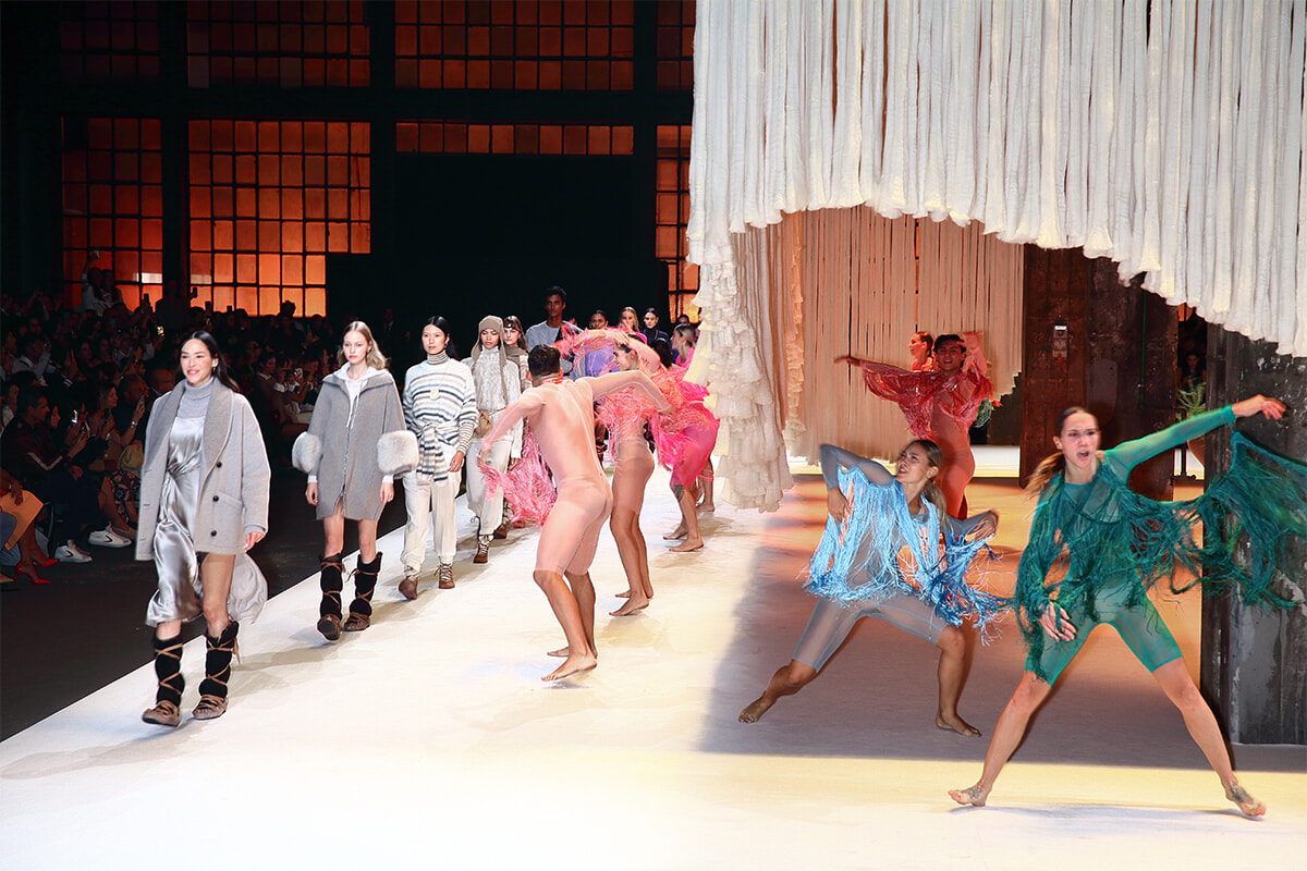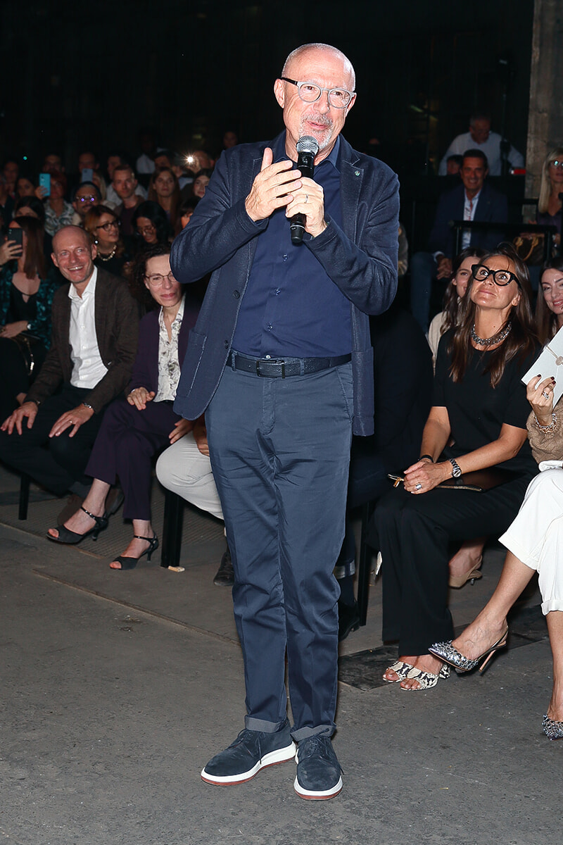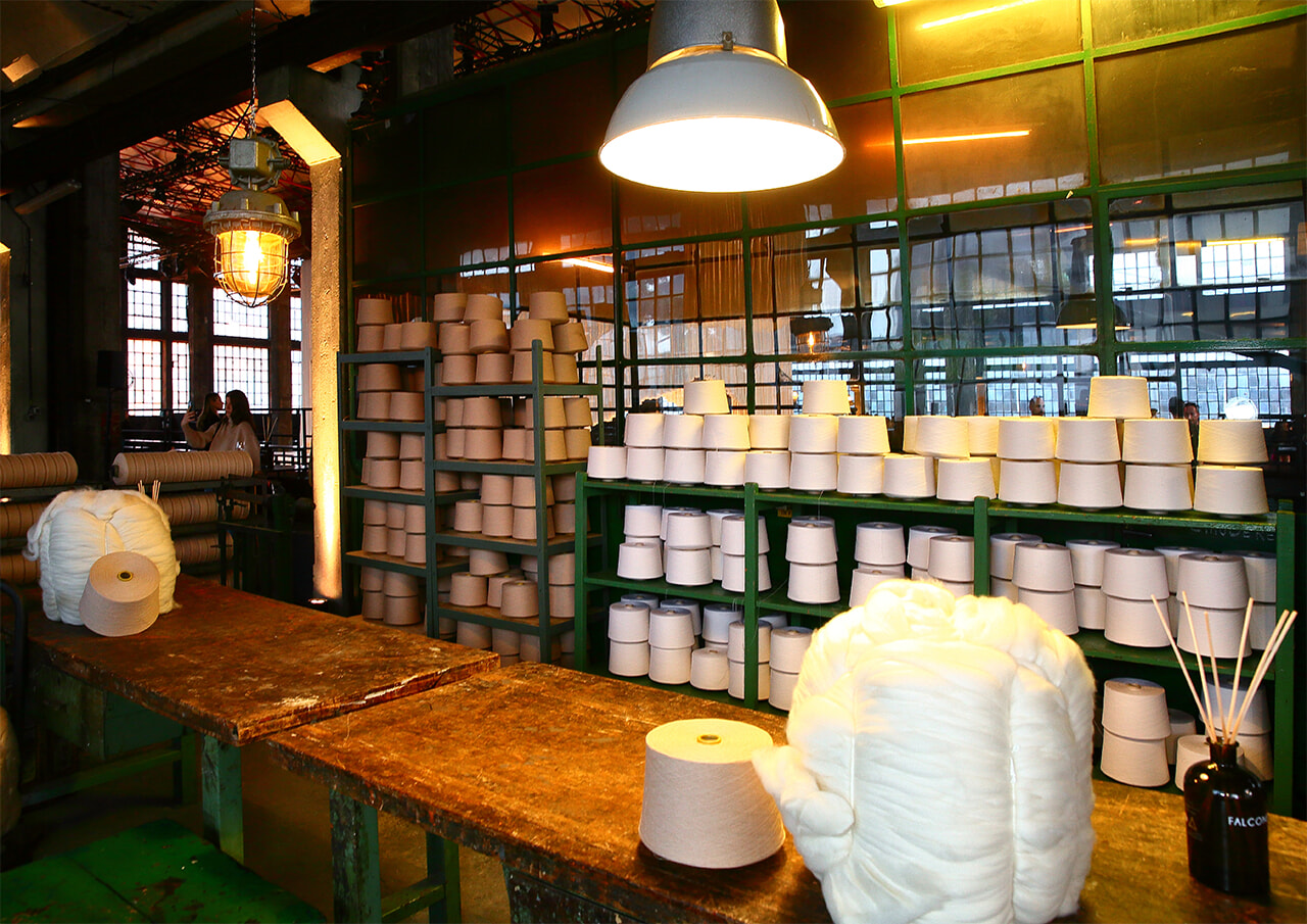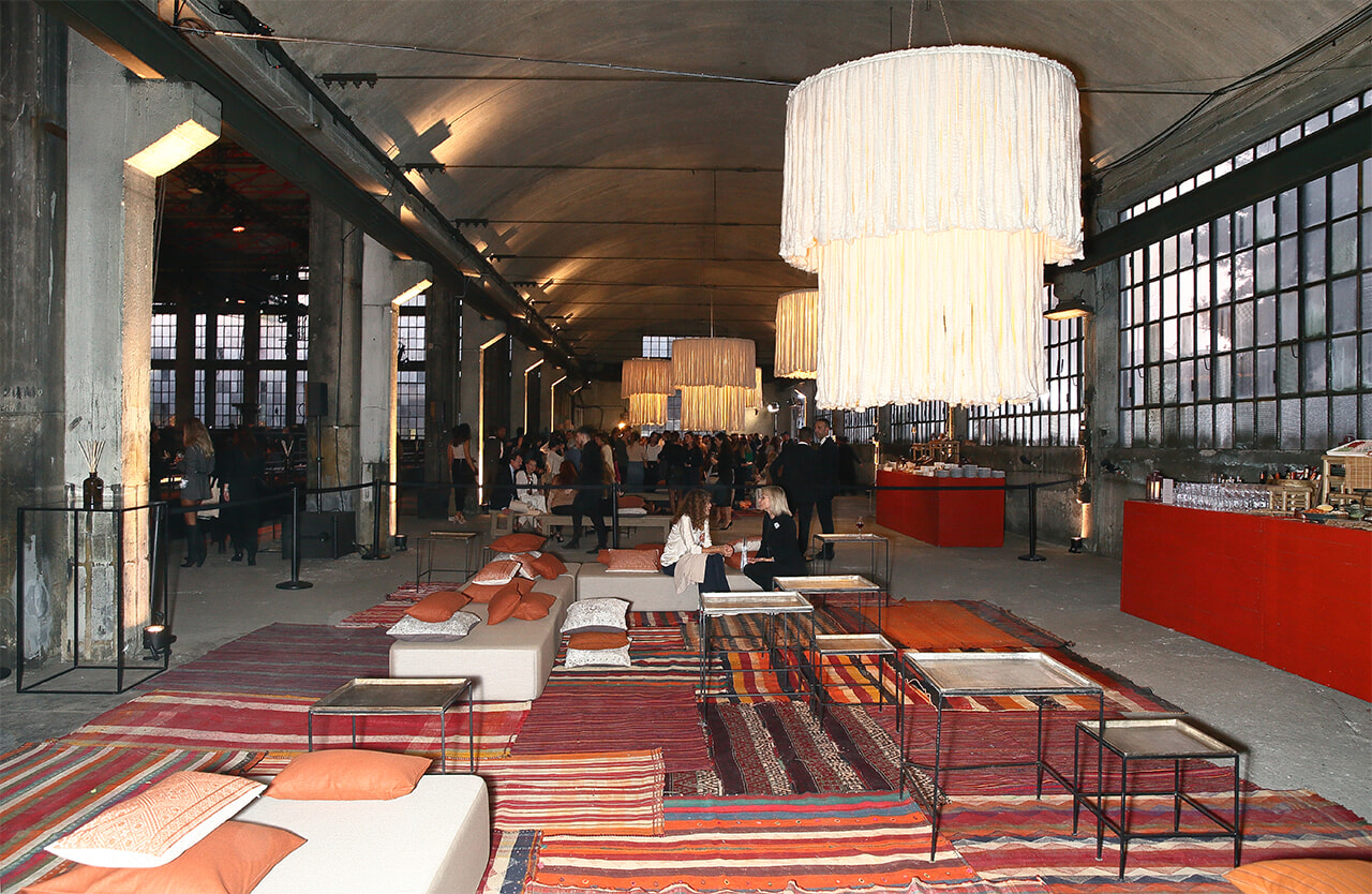 会場は、ミラノの街外れに佇む工場跡、フォンデリア・マッキ。ガラス屋根の広大なインダストリアル建築の入口には、モンゴル高原から届く木箱入りの原毛や、紡がれたばかりの糸が展示されている。製造過程の雰囲気を伝える空間の中で、カシミヤの柔らかさと温かみを体感できる演出だ。インスタレーションだけでなく、会場の装飾もカシミヤへのオマージュを感じさせるもの。絨毯とクッションに包まれたパーティスペースは、原料となる山羊を育てるモンゴル遊牧民の住まいを思わせるデコレーション。フォトコールのセットをはじめ、天井から下がる巨大な照明、ショーの行われる舞台装置まで、すべてがカシミヤ素材で柔らかに包まれ、ゲストを別世界へと誘った。