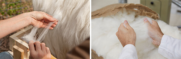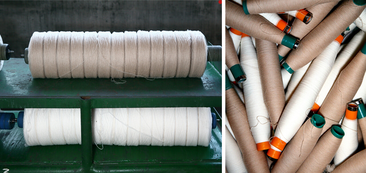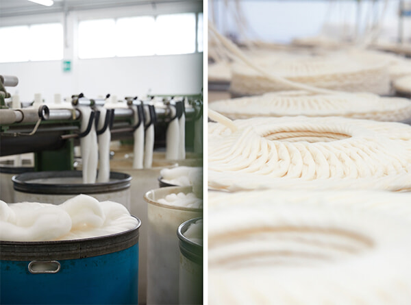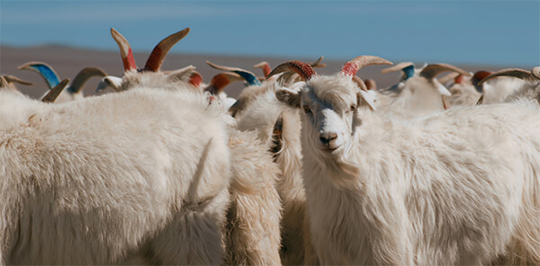 カシミヤの故郷は、モンゴル高原。この地に生息するヒルカス山羊の毛を梳くことから、温かなカシミヤが生まれる。なかでも、ファルコネーリのスーペリア・カシミヤになるのは、この地域の山羊から取れる最も細い軟毛、デュヴェを紡績したもの。モンゴルで採取された原毛は直接買い付けられ、仲介業者の手を経ることなくイタリアに直送されて、自社工場で糸となり、服のかたちに生まれ変わる。全工程を自社で管理することで、サプライチェーンの労働者、動物、環境への配慮、品質管理が可能になり、適正な価格が実現できるのだという。
