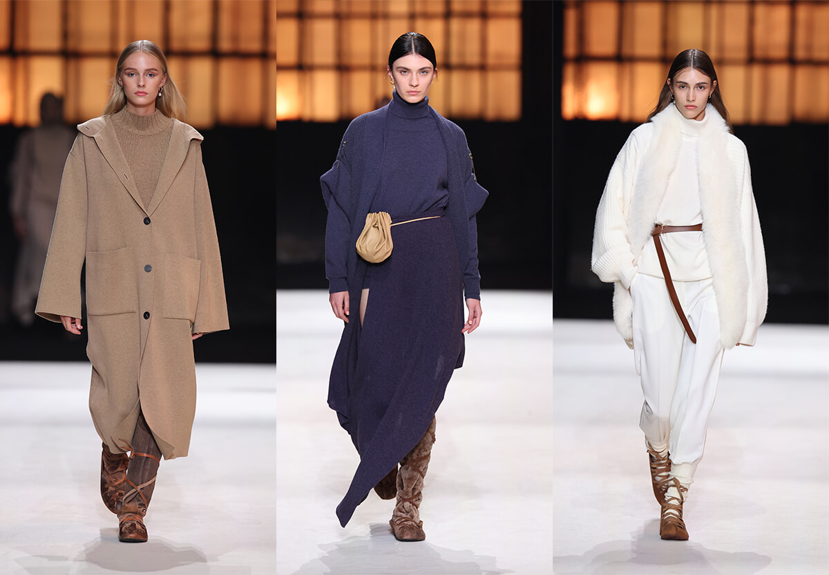 ソワレのメインイベントは、2023年秋冬コレクションのショー。カシミヤの房がカーテンのように下がる真っ白な舞台で、白い衣装に身を包んだダンサーたちがパフォーマンスを繰り広げる。続いて登場したのはベージュの濃淡の同系色を合わせたナチュラルなルック、ライラック色やピンクの鮮やかなコーディネート、雪の結晶模様を編み込んだノルディック風セーターなど。縄編みのストール、色のバリエーションが豊かなタートルネックや柔らかなパンツといったベーシックでタイムレスなアイテムが、軽く薄い素材を生かした重ね着のスタイリングでさまざまに提案された。