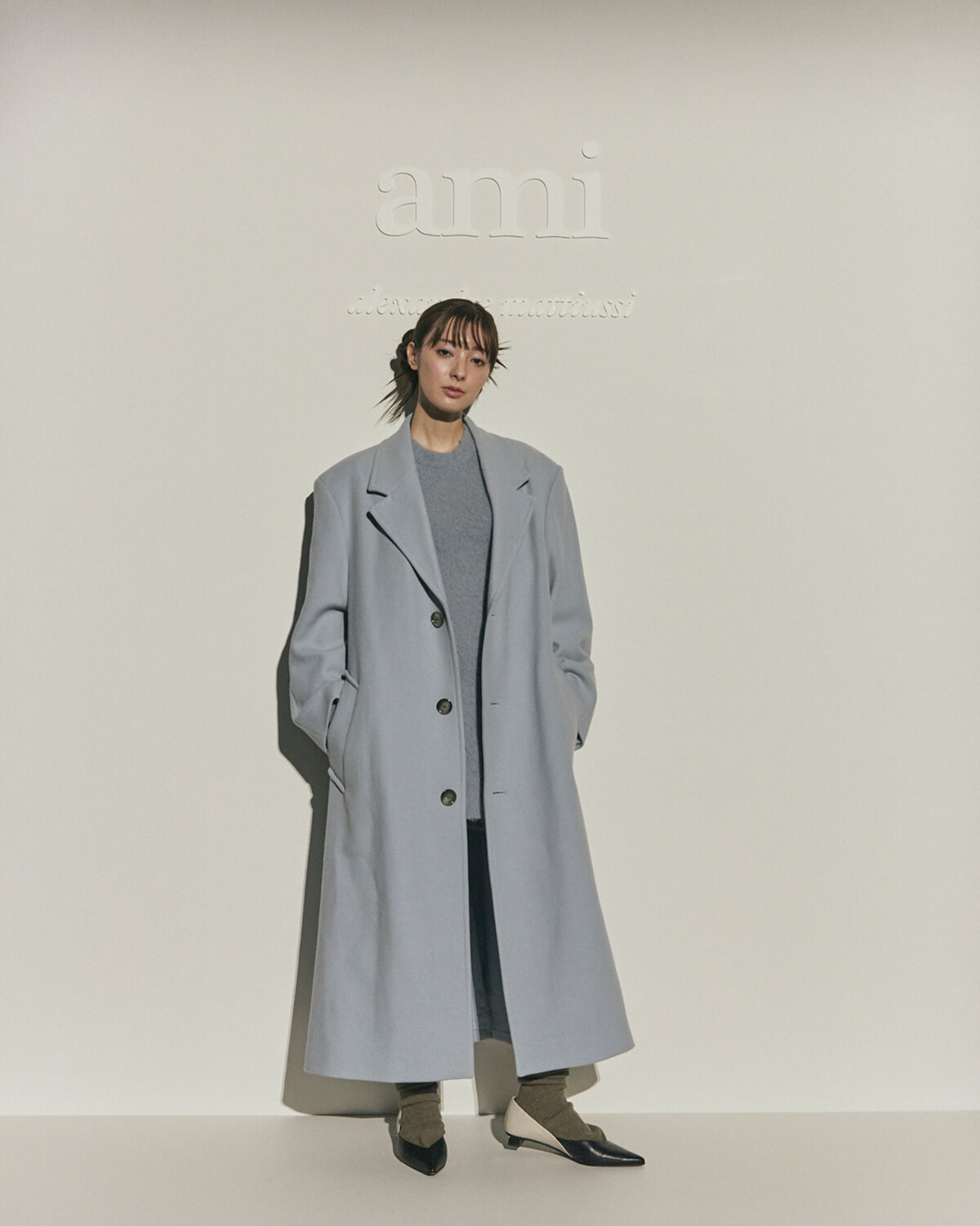 宮本茉由はライトグレーのインナーとペールブルーのコートでクールな装い。