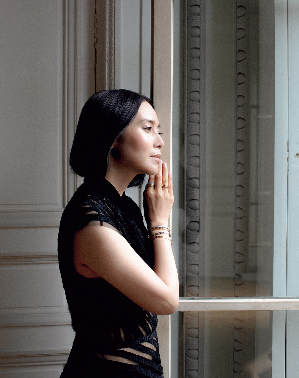 「ボワ ドゥ ローズ」リング右手人指し指(PG×WG×ダイヤモンド)¥1,450,000、右手中指指先から同リング(WG×ダイヤモンド)¥940,000、(PG×ダイヤモンド)¥880,000、同ダブルリング(WG×ダイヤモンド)¥1,700,000、同ブレスレット(PG×WG×ダイヤモンド)¥7,600,000、同ブレスレット左手手先から(WG×ダイヤモンド)¥1,850,000、(PG×ダイヤモンド)¥1,750,000/以上ディオール ファイン ジュエリー、ドレス¥2,100,000/ディオール(以上クリスチャン ディオール)