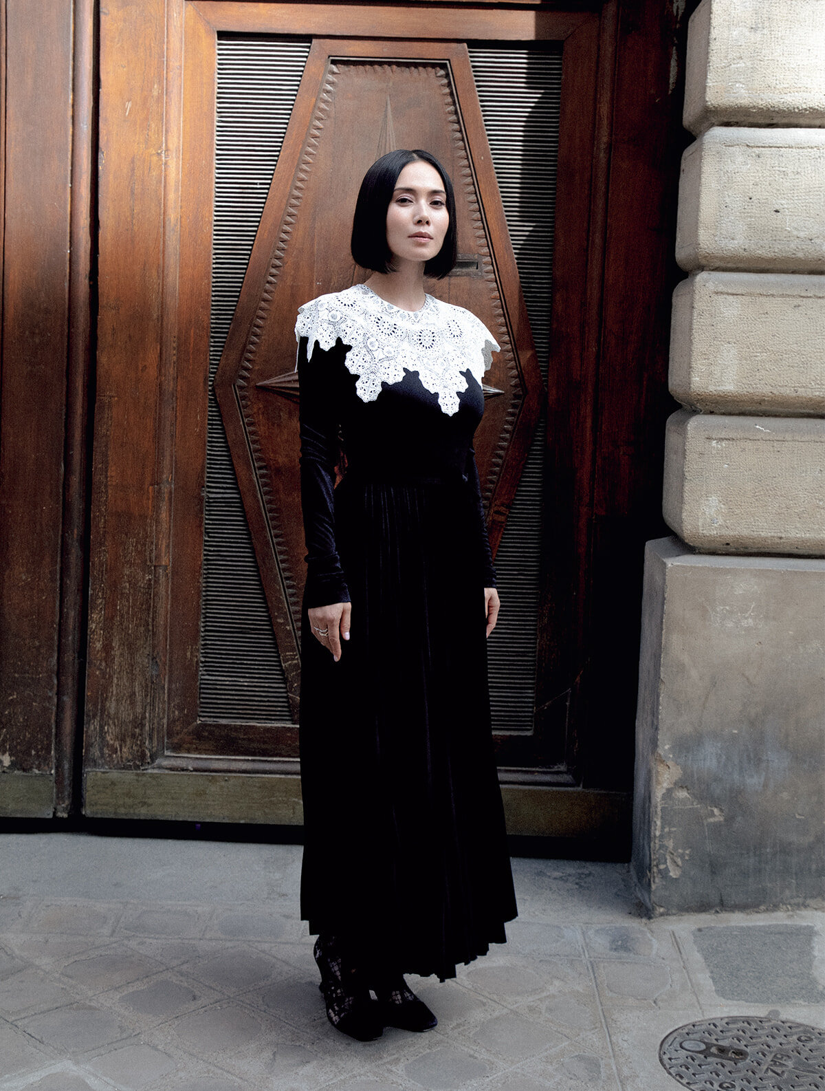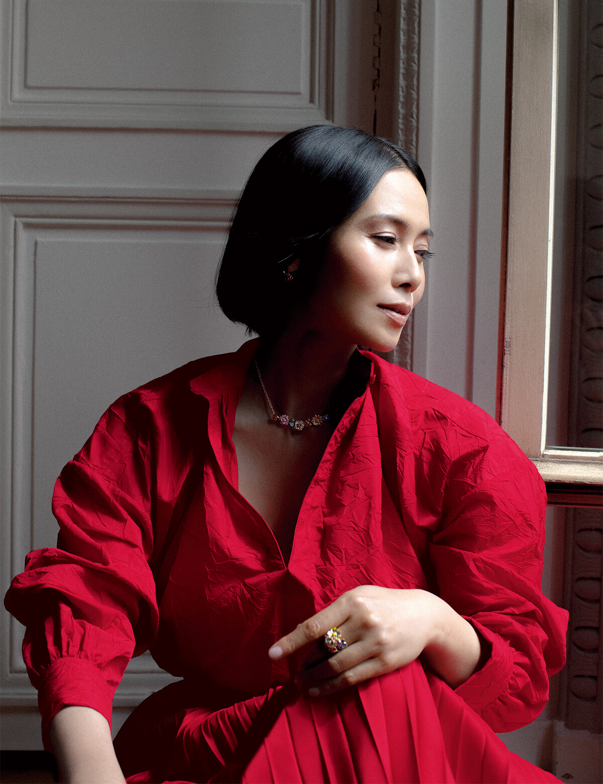 レースの襟とメゾンの職人技による繊細なプリーツが融合したロマンティックな一着。控えめにリングを着けて、上質なエレガンスを表現。