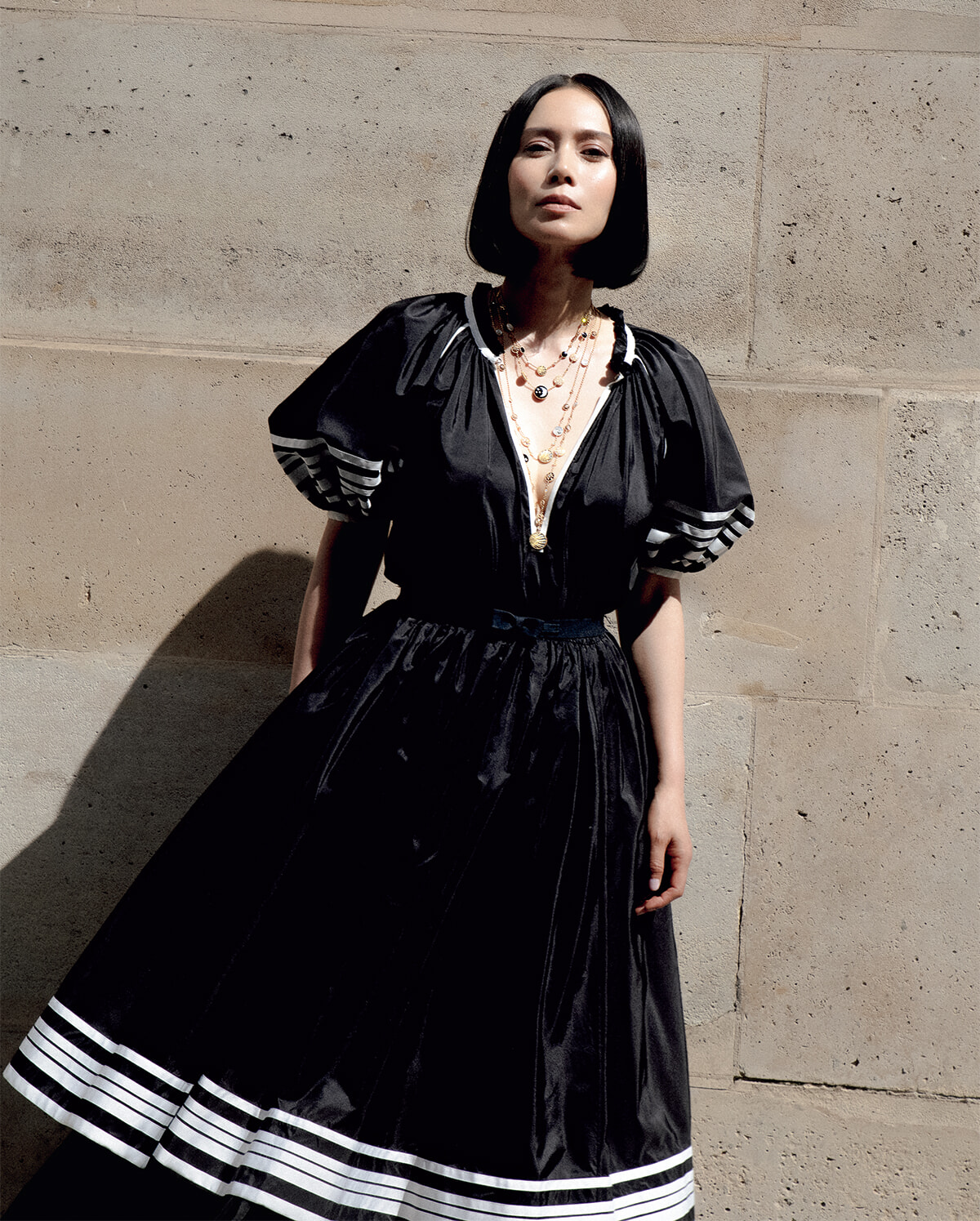 風をはらむドレスは、メキシコの伝統衣装に用いられるストライプがポイント。ダンスドレスに着想を得た、たっぷりとしたドレープ使いも印象的。深く開いた胸元を飾るネックレスとともにコーディネートに色香が漂う。