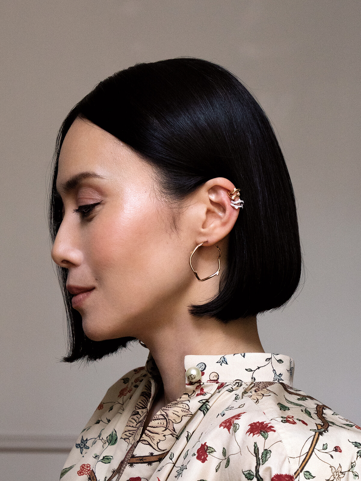 「ボワ ドゥ ローズ」イヤカフ上(YG×ダイヤモンド)¥350,000、下(WG×ダイヤモンド)¥700,000、同イヤリング(YG)¥880,000/以上ディオール ファイン ジュエリー、ブラウス¥470,000/ディオール(以上クリスチャン ディオール)