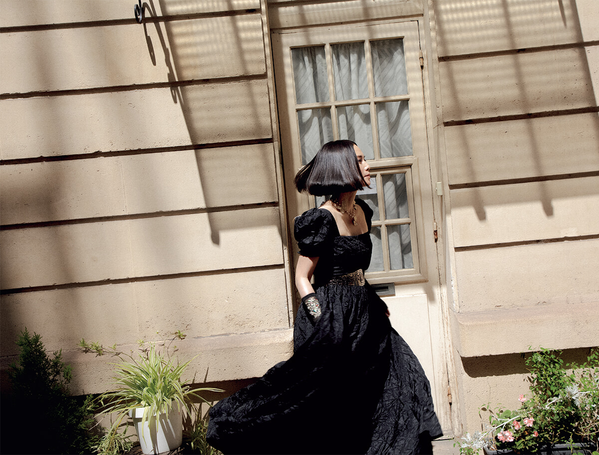 ロングドレス¥720,000、シューズ¥324,000/ともにディオール、「ボワ ドゥ ローズ」リング(PG×WG×ダイヤモンド)¥1,450,000、同ダブルリング(WG×ダイヤモンド)¥1,700,000/ともにディオール ファイン ジュエリー(以上クリスチャン ディオール)