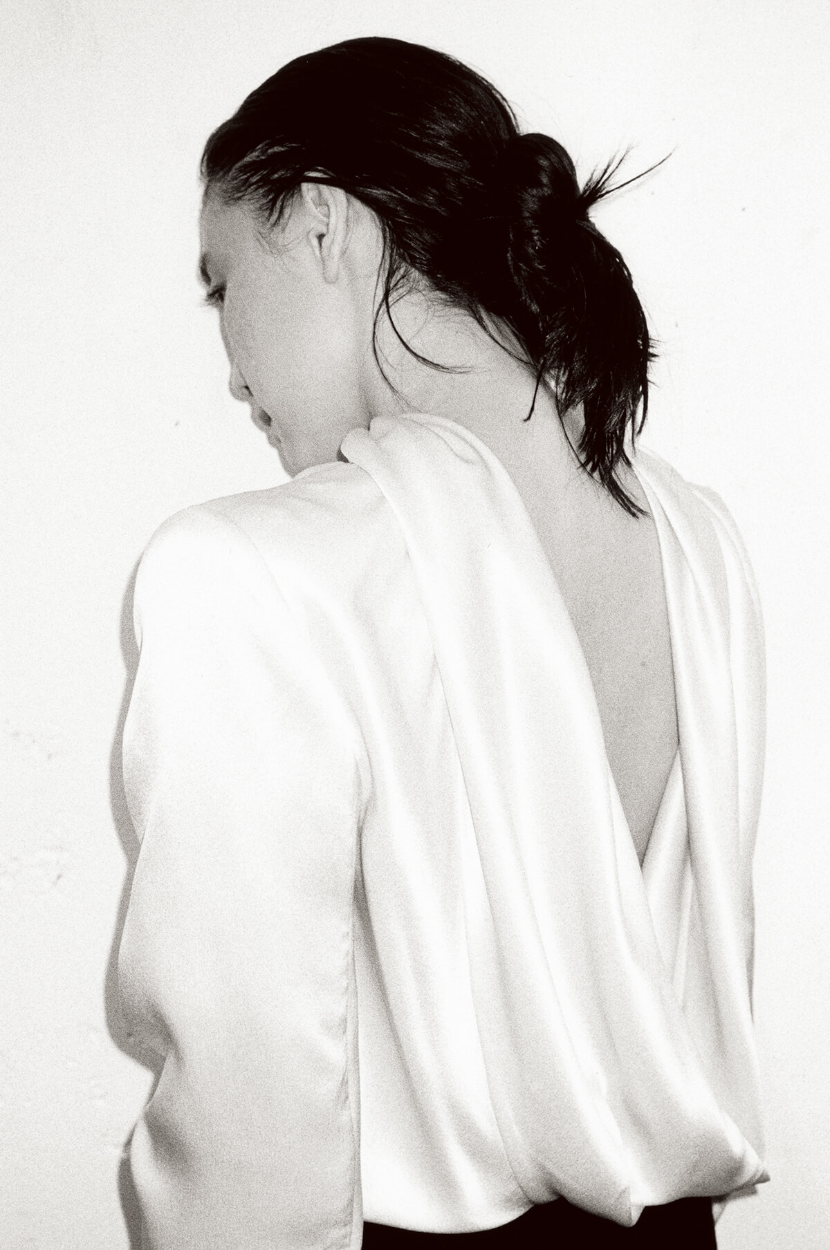 真摯にエレガンスと向き合う、穏やかな白。服と、それを纏う人との親密な関係を浮き彫りにする。たゆたうようなドレープが描く美しい造形が、女性の肌にそっと寄り添う。