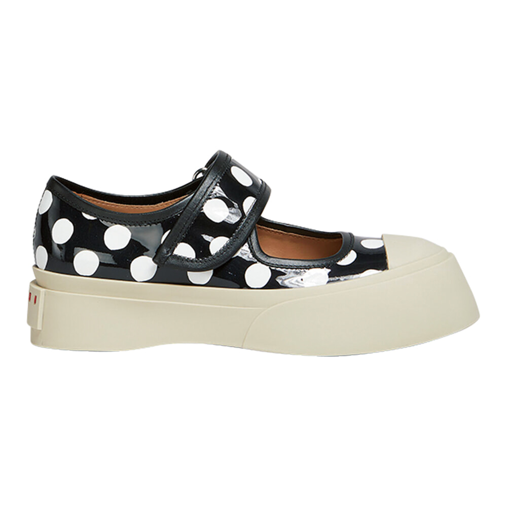 定番スニーカー「パブロ」をメリージェーンにアレンジし、今季多用されたドット柄をオン。