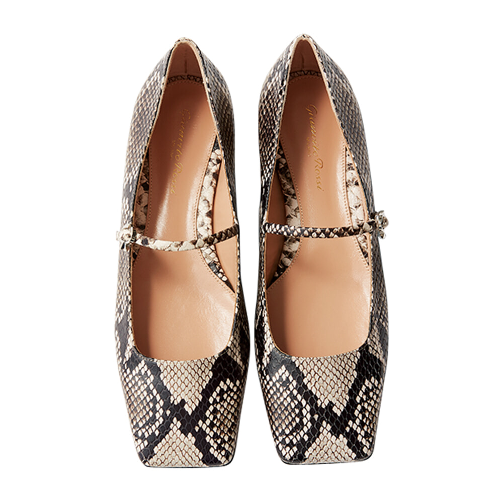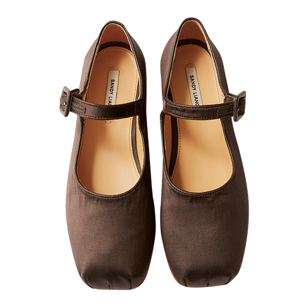 サテンの素材感やスクエアトウがバレエシューズ風ながら、調節可能なピンバックル式ストラップやブルネットカラーで街仕様に。